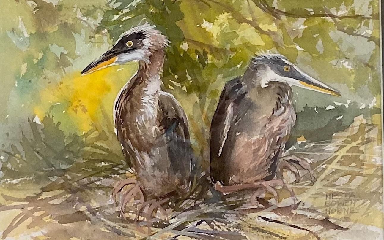 This image is a study of Blue Heron Chicks (Ardea herodias) - long-legged, long-necked, freshwater and coastal birds, with 64 recognized species, some of which are referred to as egrets or bitterns. This watercolour is likely a field sketch for a larger work or perhaps a print.Artwork Details