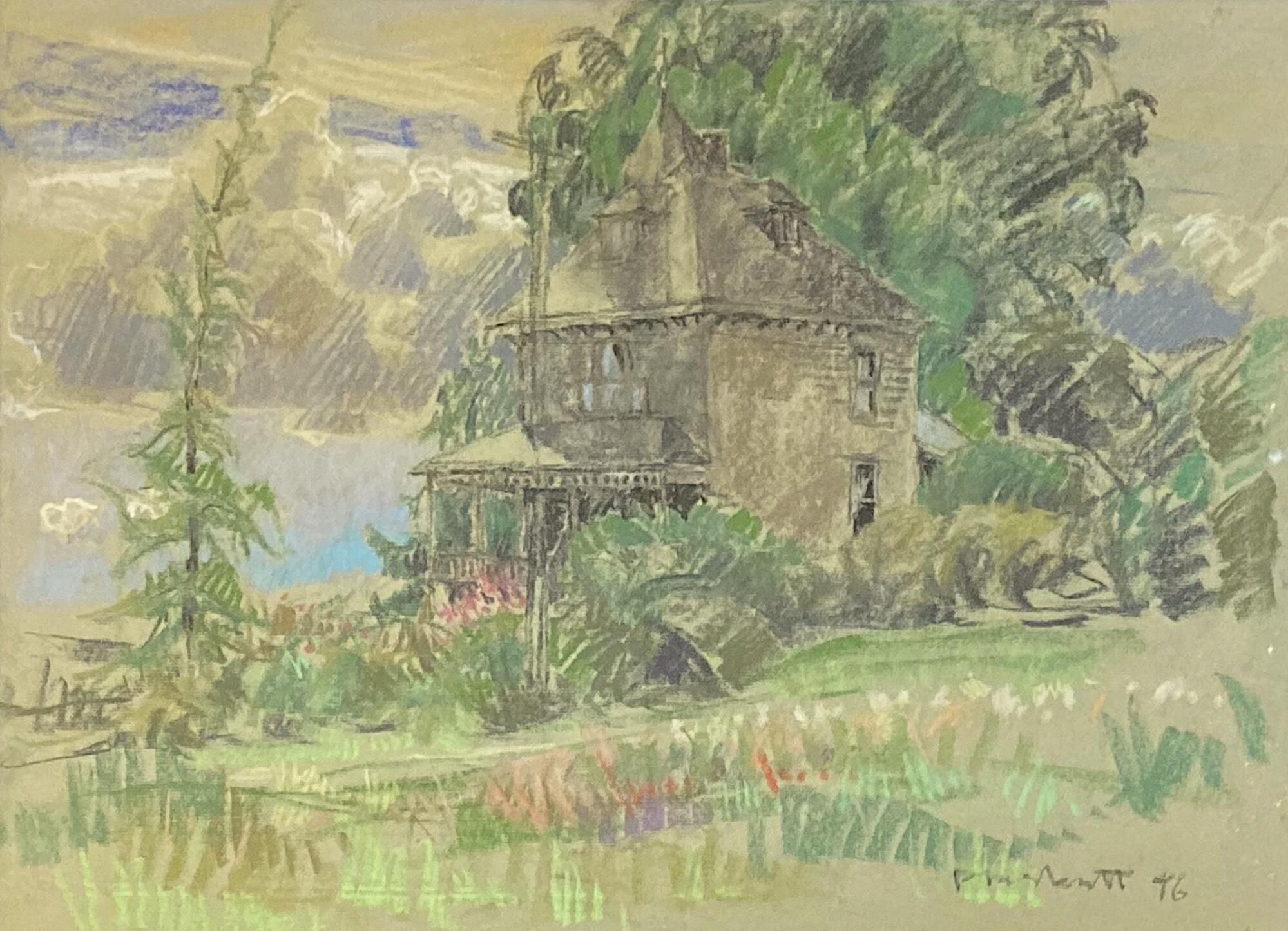 Born in New Westminster, B.C., Joseph (Joe) Francis Plaskett was an acclaimed Canadian artist, teacher and philanthropist, known for his landscapes and still lifes. He initially studied history at the University of British Columbia, and taught school for six years and dabbled in art with evening classes at the Vancouver School of Art, experimenting with Impressionism, Expressionism, Surrealism and Abstraction. In 1945, he decided to become serious about his art, studying at the Banff School of Fine Arts, where his teacher was Group of Seven artist A.Y. Jackson (1882-1974). He also joined the B. C. Society of Artists, and in 1946, having been awarded the first Emily Carr Scholarship for study in the U.S. by Group of Seven artist Lawren Harris (1885-1970), he studied at the San Francisco School of Art.  In summers he studied in New York and and Provincetown, Massachusetts, studying with noted Abstract Expressionist Hans Hofmann (1880-1966) who reportedly transformed Plaskett from an Abstract artist into a figurative painter. Afterwards, he taught at the Winnipeg School of Art where he was made director (1947-1949).