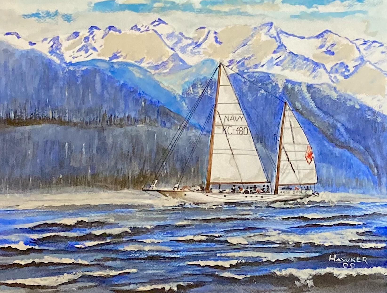 This brightly-painted seascape depicts the two-masted HMCS Oriole sailing in a choppy sea with multiple figures on board, likely on a naval training session. There are forests and snow-covered mountains behind the boat. The front sail is marked NAVY KC-480 and there is a Canadian flag mid-sail at the stern. The location is likely Victoria/Esquimalt with the Canadian Rockies or the U.S. Olympic Mountains in the background.Artwork Details