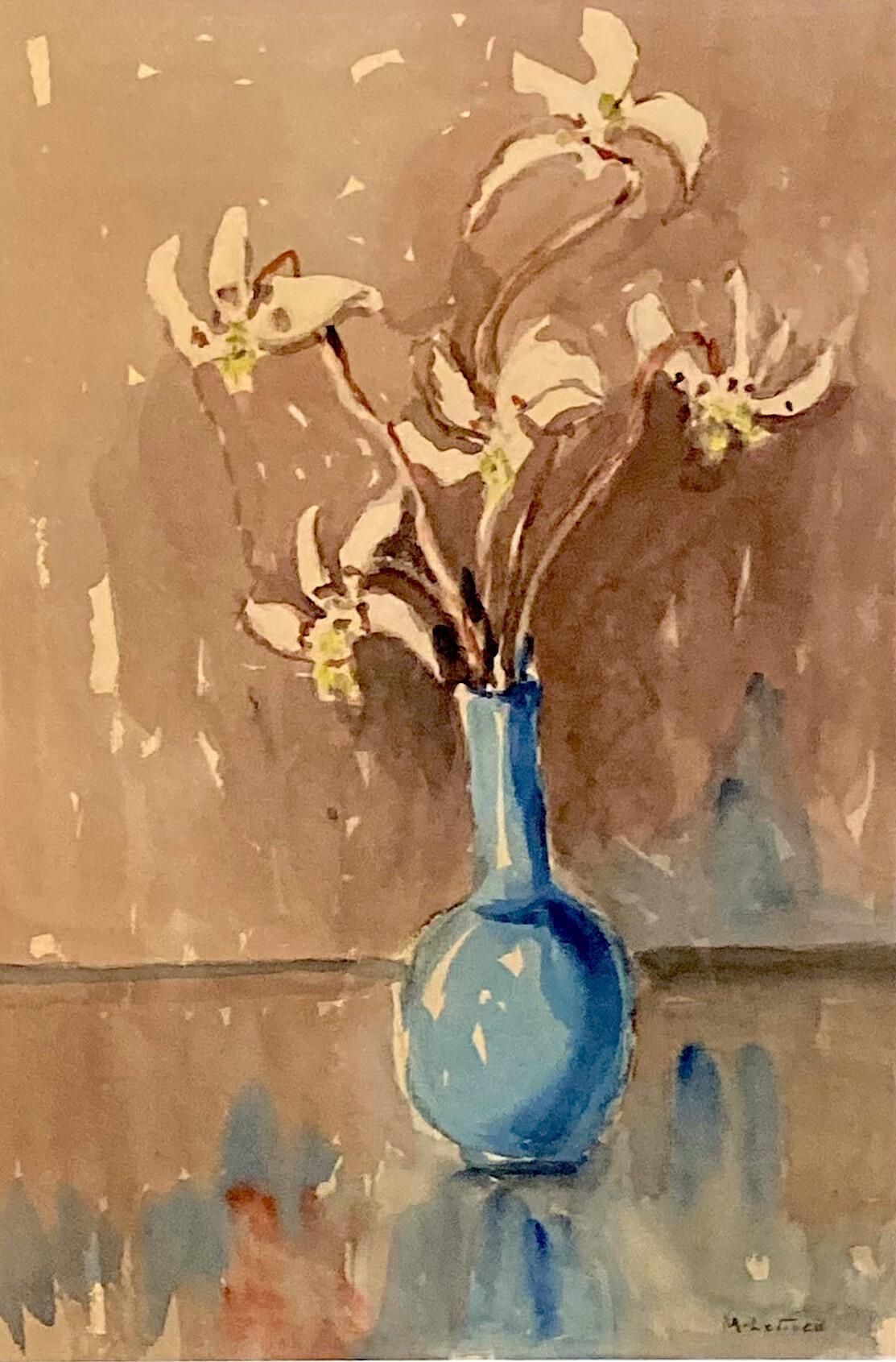 This still-life depicts a long-necked turquoise gourd vase holding showy cream-coloured lily-like flowers. These colours and shapes are reflected in the coral-brown table and the background creating a cheerful and lively feel to the painting.Artwork Details