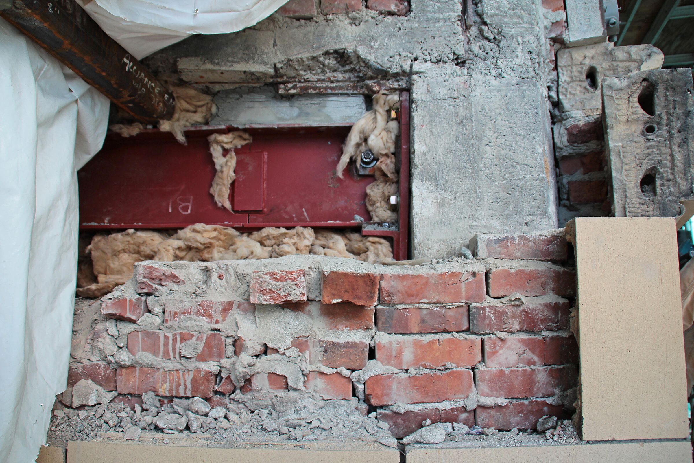 This colour image depicts the exterior restoration work being done in 2016 on the Union Club at 805 Gordon Street at Humboldt, Victoria, B.C. It details wall construction showing deterioration, southwest corner of the Club’s building foundation.