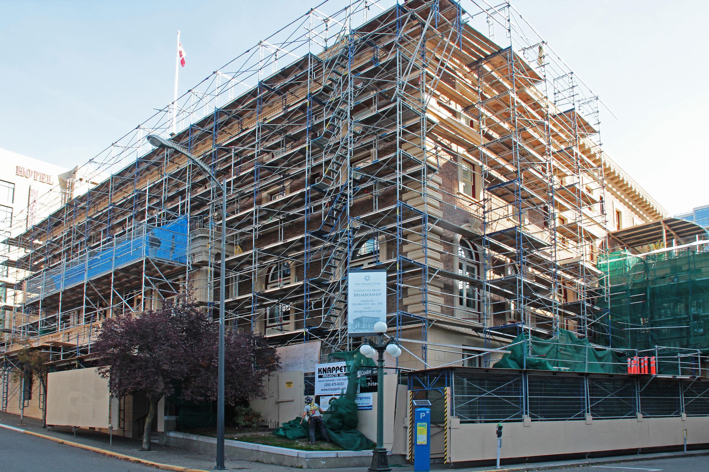 This colour image depicts the exterior restoration work being done in 2016 on the Union Club at 805 Gordon Street at Humboldt, Victoria, B.C. It shows the Club building with scaffolding from the southwest corner.