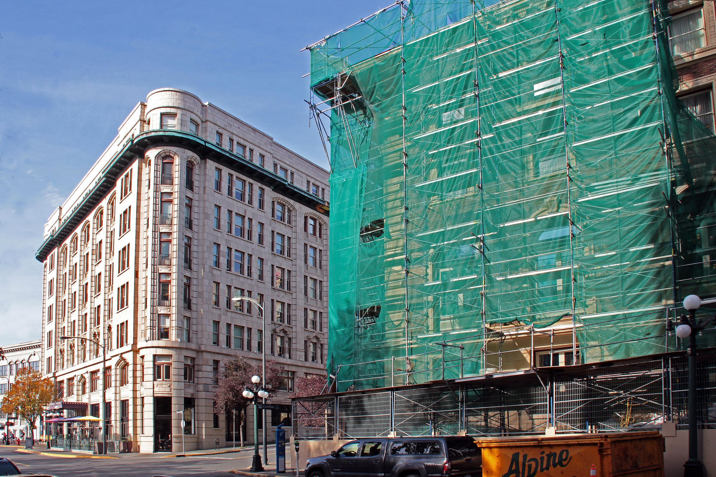 This colour image depicts the exterior restoration work being done in 2016 on the Union Club at 805 Gordon Street at Humboldt, Victoria, B.C. It shows the scaffolding and wrap on the Humboldt Street Club façade looking toward the Belmont Building.
