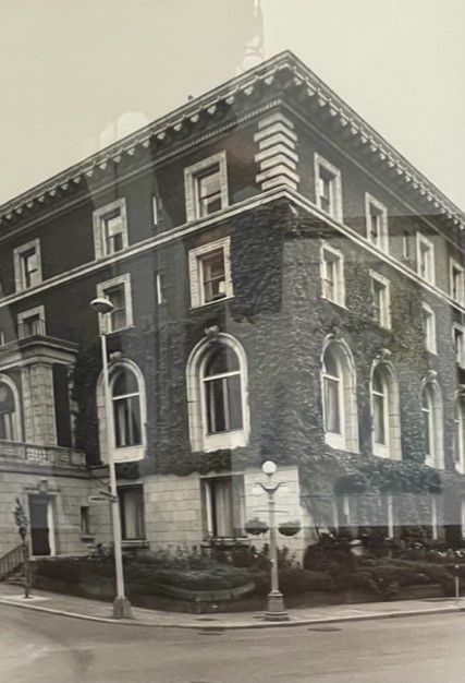 This black and white image depicts the southwest corner of the Union Club at 805 Gordon Street at Humboldt, Victoria, B.C. It shows the the Club’s architectural features prior to the five-year building renovation project, initiated in 2017.