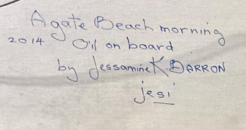 She married artist Syd Barron (1917-2006), living in Victoria and later Coombs, where they opened their own studio and gallery.  Barron continues to draw and paint in many mediums, preferably outdoors by the ocean depicting seashores and seascapes. She has painted and exhibited in Cornwall, Toronto, Deep River, Vancouver, Victoria and many other locales on Vancouver Island. She is a member of the Canadian Plein Air Painting Group.Inscription/Signature/Marks