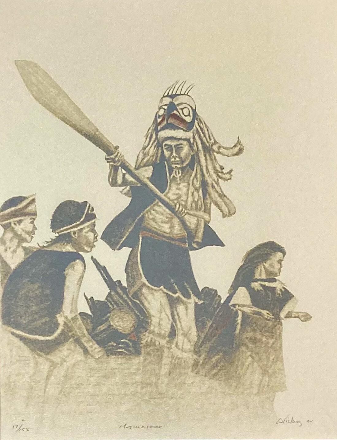First Nations artist Arthur Vickers was asked by Vancouver, B.C.'s Grace Hospital (now B.C. Women's Hospital and Health Centre) to create a work of art to embody his feelings about the hospital where he, and his wife were born. The art also serves as a remembrance to his mother, Grace, who passed away one year after the Motherhood series was completed.  This is Vickers' only work of art where his family members were the models. You will note the eagle feather, often included in his art (visible in the small window mat opening below that of the main image) - Vickers' mother was adopted into the Eagle clan and he is a member of the same clan. Vickers drew his specific inspiration for this series from a meeting of First Nations from across the Northwest Coast at Bella Bella on Campbell Island in the Central Coast region of B.C. in 1993.Made/Created