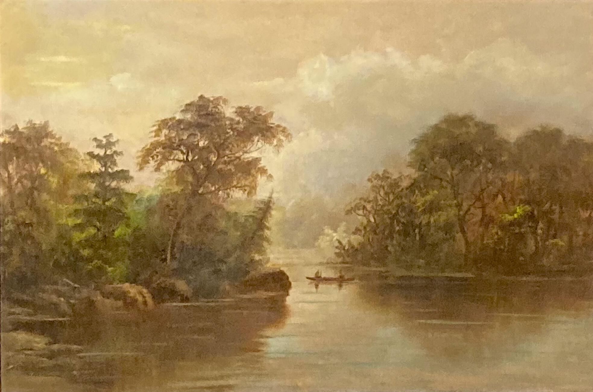 This picturesque landscape depicts a wilderness lake with several figures in a boat at the centre of the image. The trees and clouded sky are reflected in the lake with a muted and overall grey-green monochromatic and atmospheric effect. A soft shaft of light highlights the figures in the boat and extends toward the viewer, partially interrupted by lakeside trees. There appears to be a house hidden in the trees and shadows on the right side. The location is unknown.Type of Painting