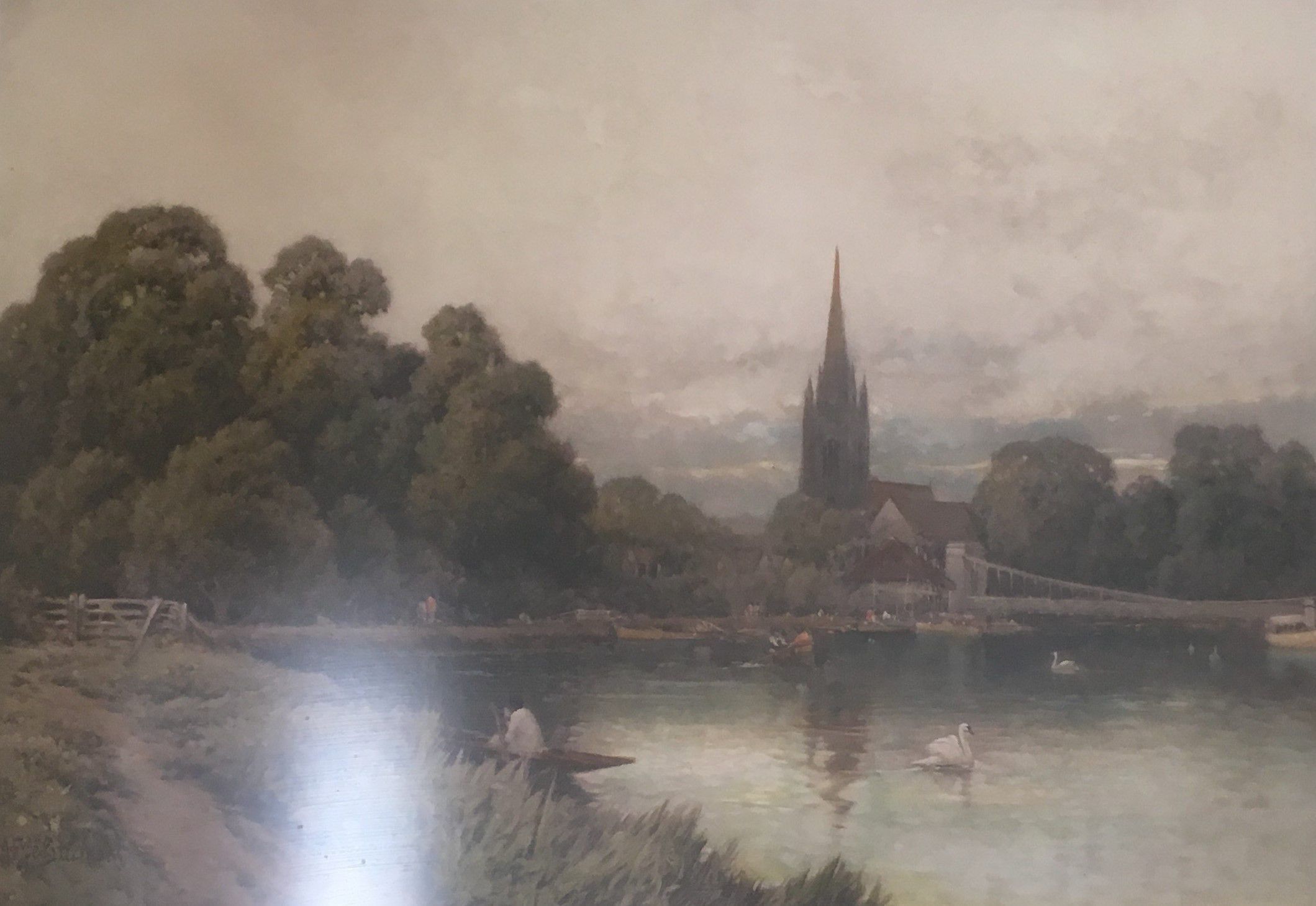 This peaceful scenic landscape image depicts Great Marlow (now Marlow), a market town and a parish, Buckinghamshire, on the River Thames, west of London, England. The print shows the town with All Saints Church with its tall spire and a bridge to the right. Walkers and boaters are enjoying the river, as are the white swans, with green banks and tall trees in the background.Artwork Details