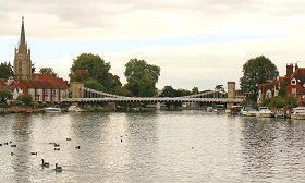 There has been a church in Marlow since ca. 1070; however, the current Church of All Saints was built 1832-1835 on the same site after the spire of the previous church collapsed in 1831. And there has been a bridge since the reign of King Edward III (1327-77), though an original crossing may date from 1309. The bridge has been damaged/destroyed and rebuilt/restored in various forms over the centuries and today the current suspension bridge, built 1829-1832, connects the town of Marlow, Buckinghamshire and the village of Bisham in Berkshire.Made/Created