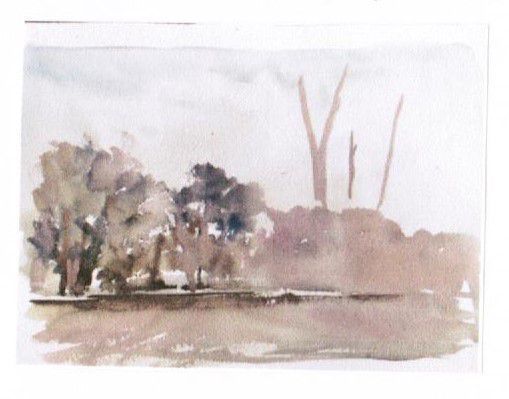 This unfinished and mostly monochrome landscape depicts trees with foliage on the left with formless shrubs and bare tree trunks to the right background. The foreground is devoid of detail. The location is unknown.Artwork Details