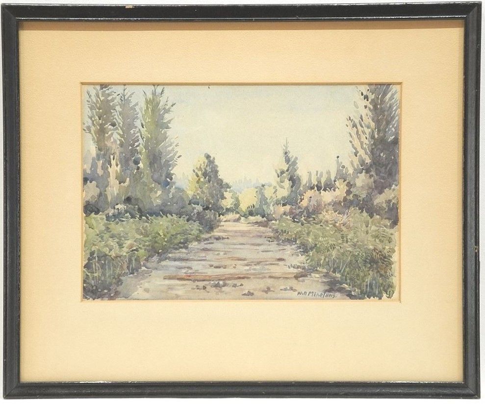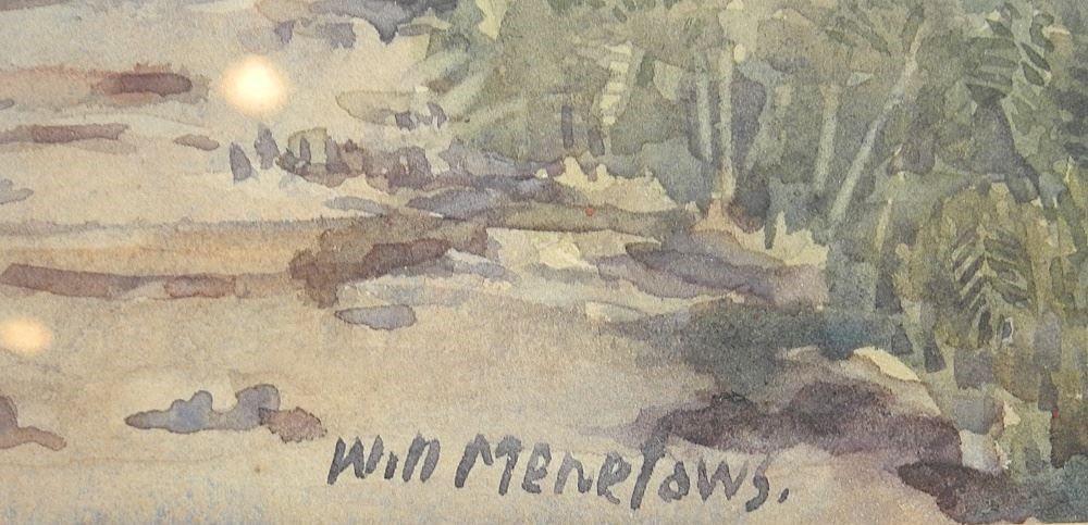Menelaws exhibited his work with the Island Arts and Crafts Society starting in 1912 up until 1940. He also exhibited at the B.C. Society of Fine Arts spring exhibitions , The Seattle Art Museum, the British Columbia At Work exhibition at the Vancouver Art Gallery, and had his own one-man show at the Art Gallery of Greater Victoria in 1962 at which the then director Colin Graham called him the “Dean of Victoria artists.” He was made a life member of the Victoria Sketch Club in 1964, the year he moved to Port Angeles, Washington.