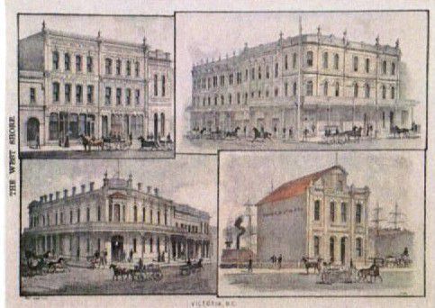 This chromolithograph is a four-part composite illustration depicting buildings with various figures (walking, riding, in carriages) in downtown Victoria, B.C., a page from "The West Shore", an illustrated journal (Vol. 10, Sept. 1884, page 270). This American magazine covered British Columbia and its cities a number of times in the late 1800s. One of the notable photographers of Victoria in the later 1800s, Richard Maynard (1832-1907) and perhaps his wife Hannah Hatherly Maynard (1834-1918), also a notable photographer, provided photographic images of the city for the publication.