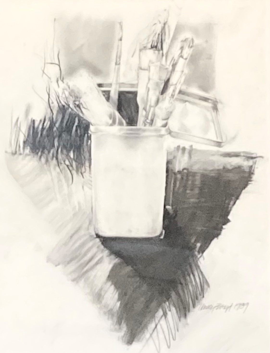 This still-life depicts an open lidded tin box containing different types of well-loved brushes, the tools of the artist's trade, perhaps those of the artist herself. Considerable attention is given to portraying the smooth light-coloured metal, and the sheen and shape of the box in juxtaposition to the various materials and textures of the brushes within and the dark textured background.Context