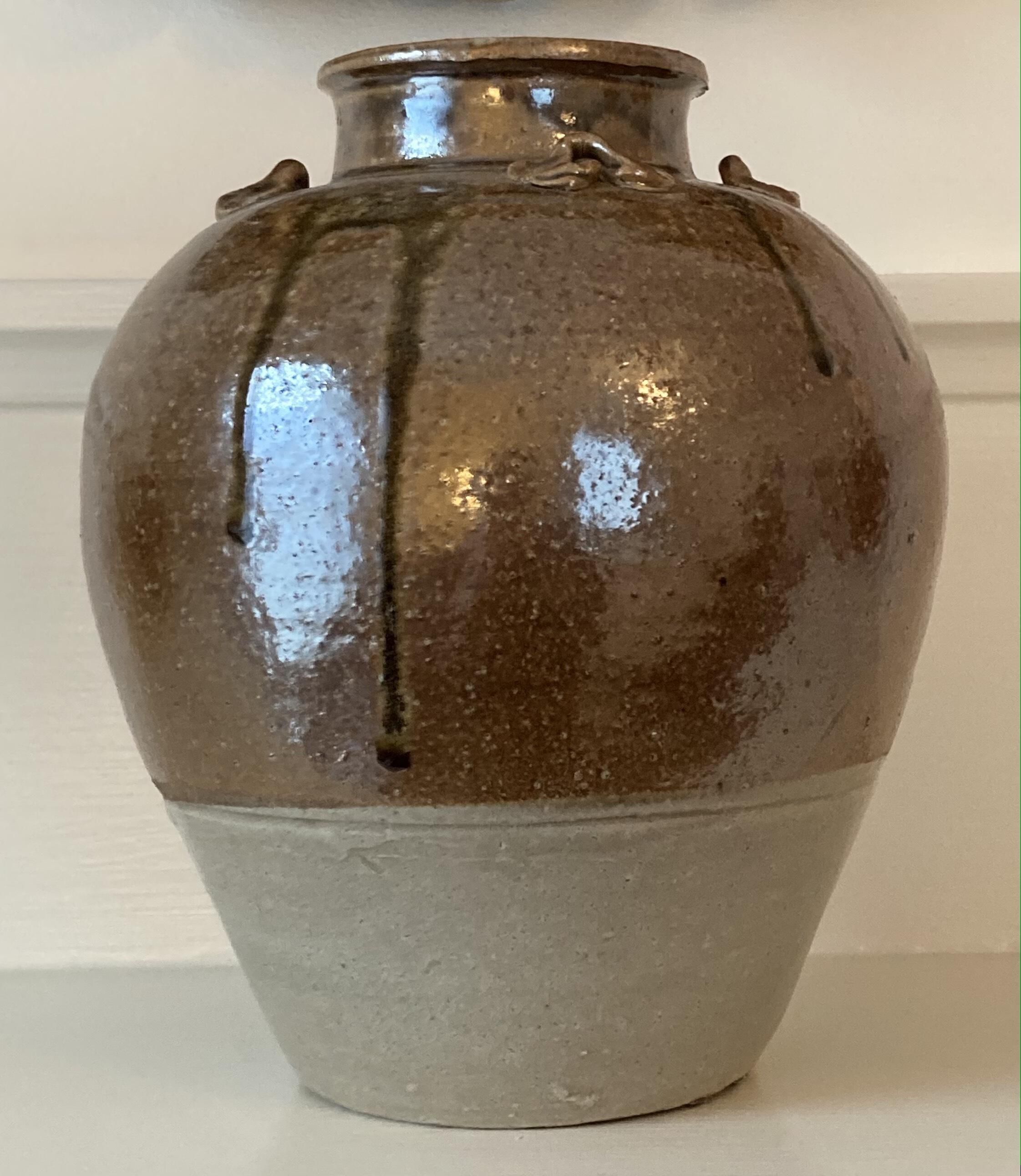Kiln-fired clay with brown gloss glaze and dark drip design on the upper section and the bottom quarter with a grey glaze. Shoulder-shaped vase with high neck, and leaf-like appliqués on vase shoulder.Made/Created