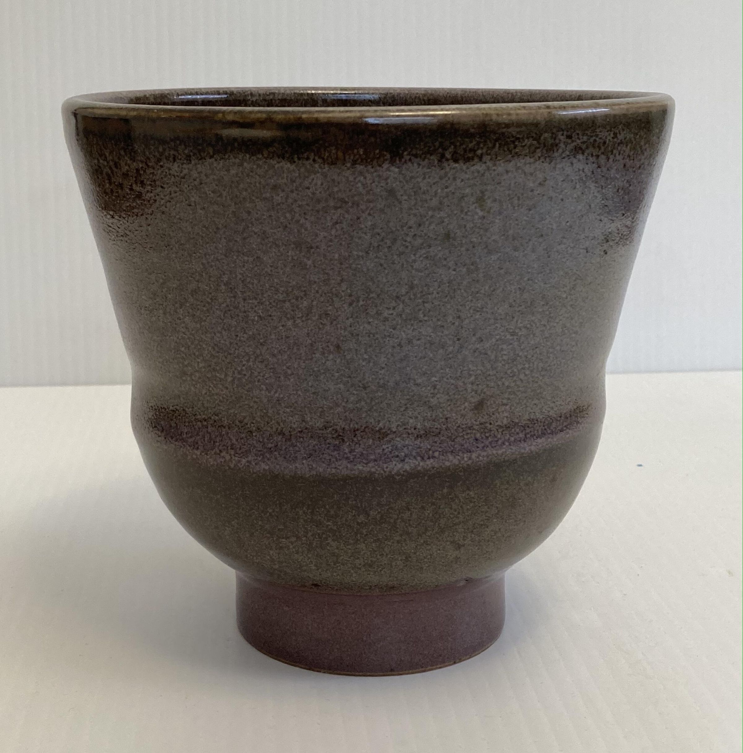 Kiln-fired clay with brown-purple-burgundy glaze, wide open mouth shape with narrow base.Made/Created