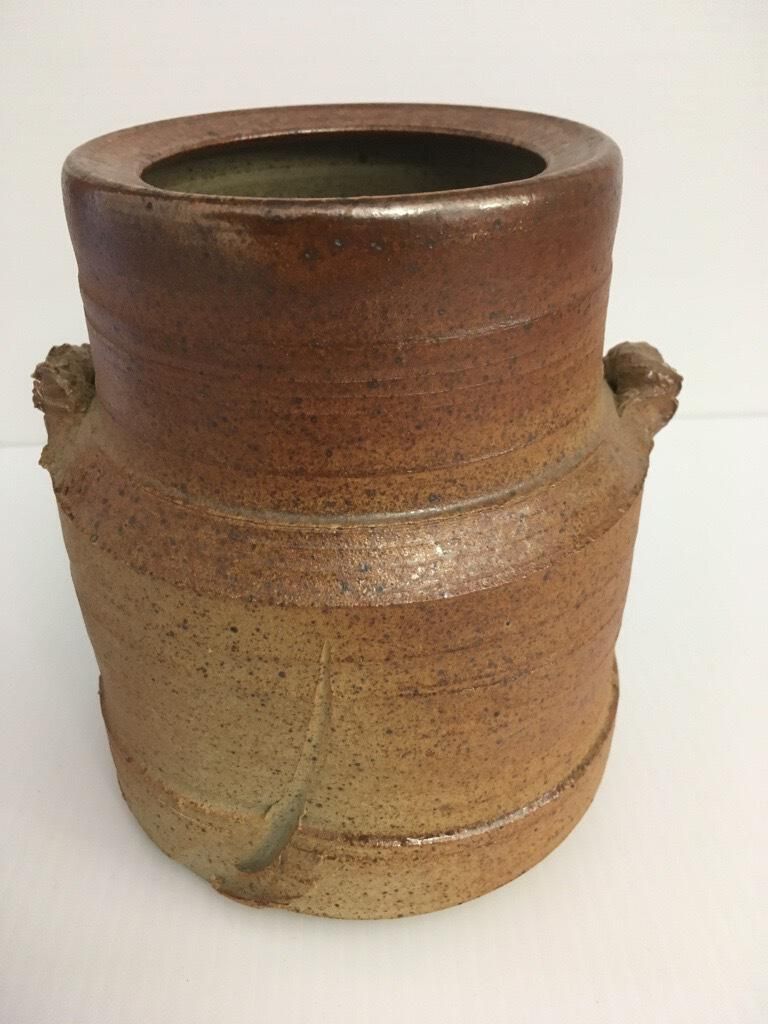 Kiln-fired clay with gradient reddish speckled glaze, darker at top. Straight-sided shape with very high neck, deep interior lip, and decorative "handles" on vase shoulder. Swoosh design with horizontal band lower pot.Made/Created