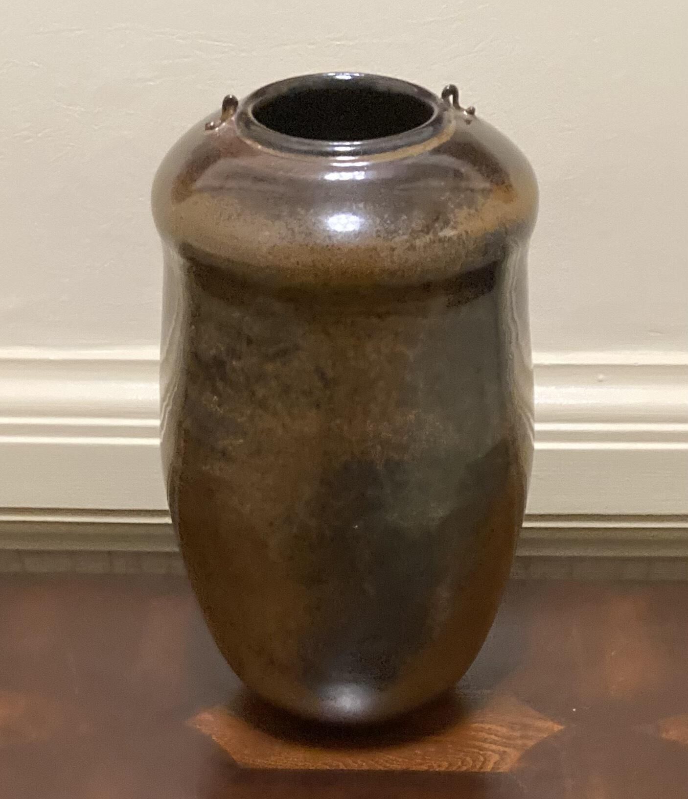 Kiln-fired clay, brown glossy lustre glaze with black highlights. Exaggerated shoulder design with small pseudo-handle appliqués at vase rim edge.Made/Created