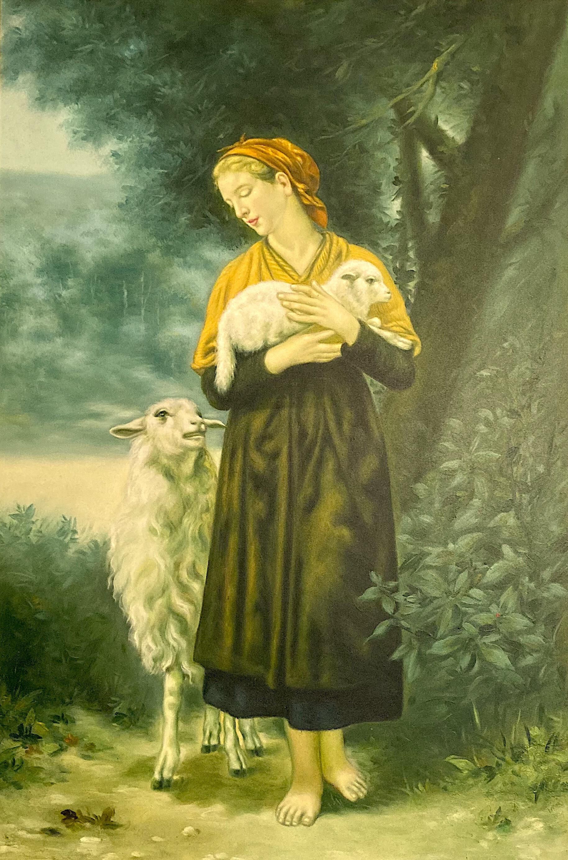 This image depicts a romanticized barefoot peasant girl in a soft green landscape with two sheep - one baby lamb in her arms and the second, likely the mother ewe, standing to her right. The girl is wearing a green dress with a yellow shawl.Type of Painting