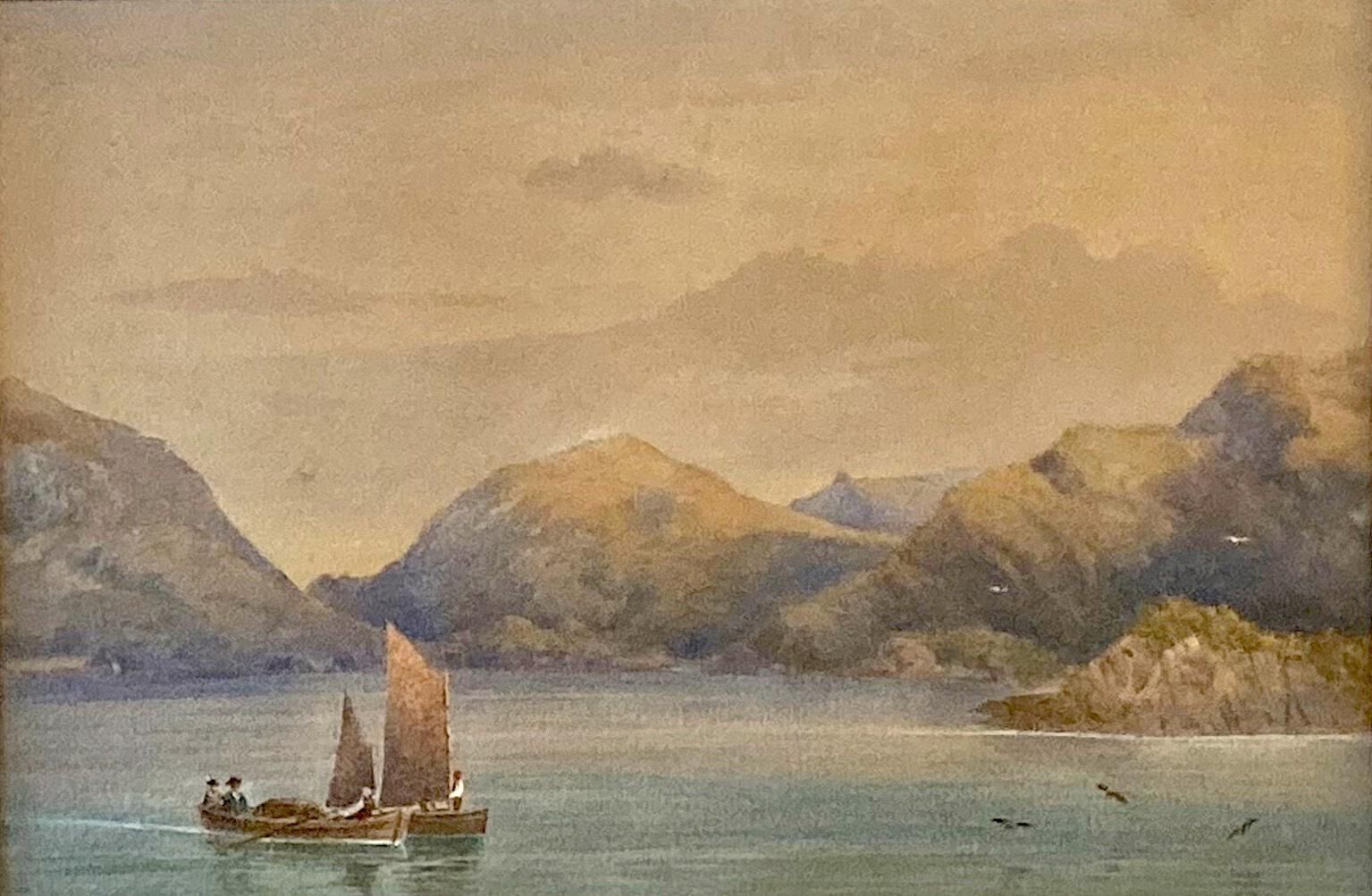 This image depicts the Killarney area in southwestern Ireland. It shows a rowboat next to a two-masted sailboat with several passengers and boatmen crossing a calm lake with hills and mountains in the background. It is a soft rural scene painted in a muted palette.Artwork Details