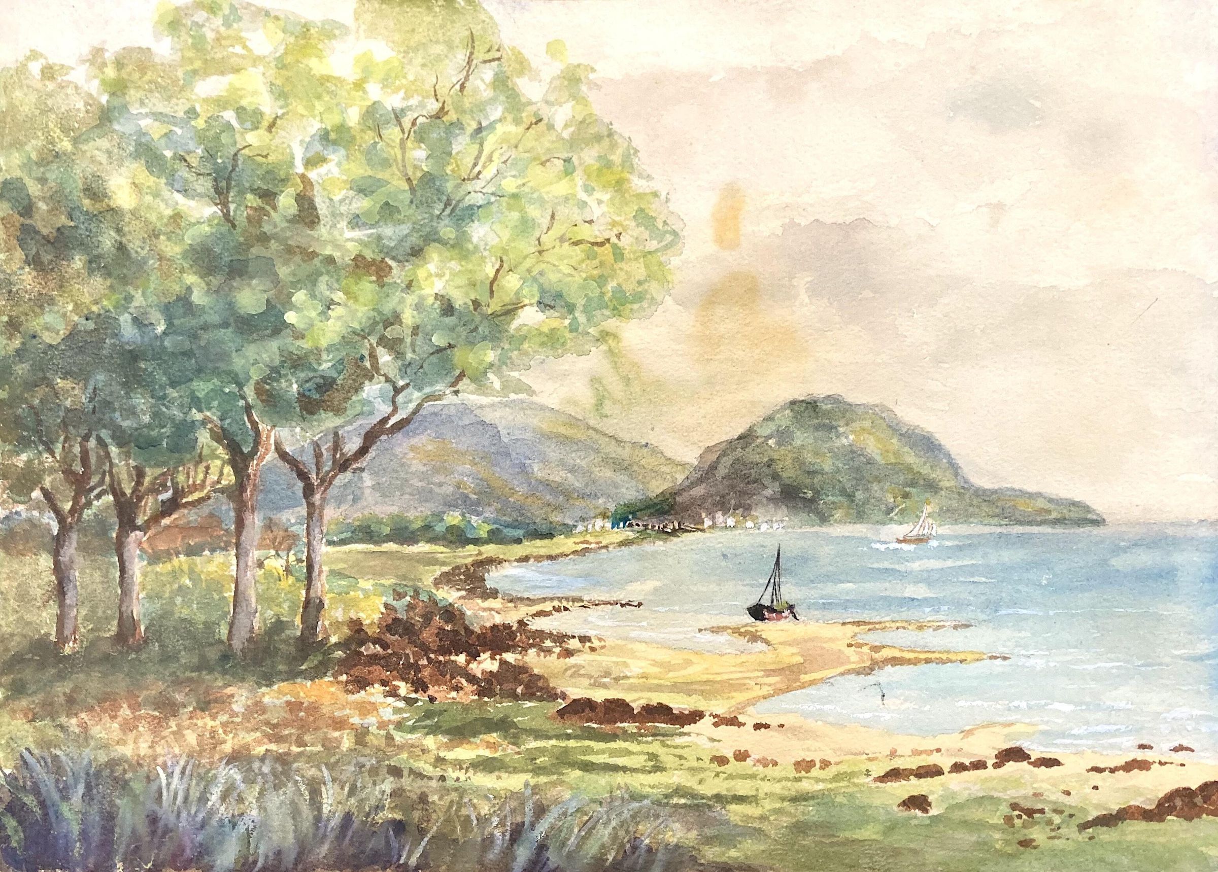 This image depicts a view of the Isle of Skye, ‘cloud island’ in Old Norse, the largest and northernmost of the major islands in the Inner Hebrides of Scotland. This landscape shows a bay with several sailboats, a shoreline with a sandy beach and grasses, trees on the left, and some hills with houses at their base in the distance.Artwork Details