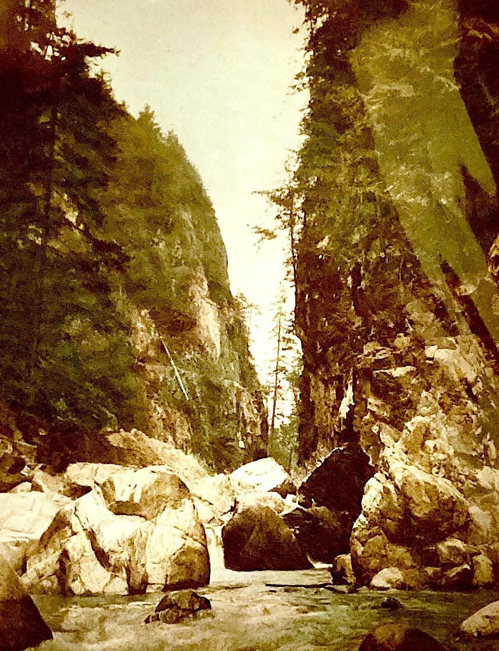 This image depicts the Salmon Leap in Capilano. "Capilano" is a First Nations word, originally spelled Kia’palano, meaning “beautiful river”. Capilano Canyon is one of the Vancouver, B.C.'s four canyons.