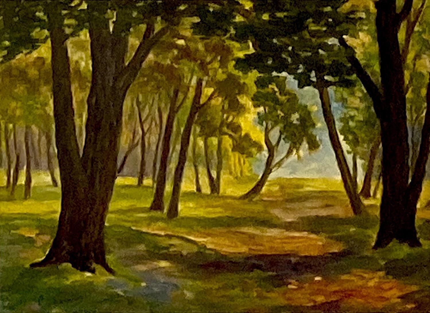 Painting This landscape depicts a view through a forest glade predominantly in rich greens and browns with two large dark trees in the foreground leading the eye toward smaller trees with brighter light in the distance. The mood created with the colour and the light is humid and sultry. The location is unknown.