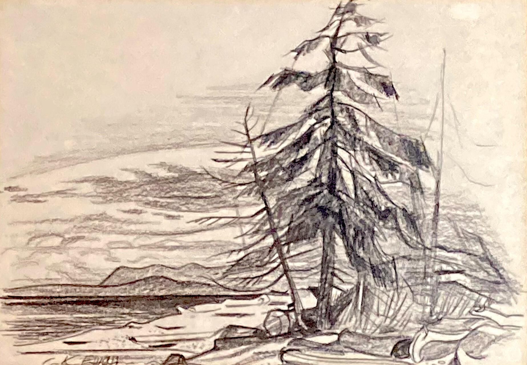 This image is a stylized depiction of a large evergreen tree (plus two smaller) with sand, grasses, driftwood logs and background mountain views at Saratoga Beach, located at the north end of the Comox Valley on the eastern coast of North Central Vancouver Island. Presented in black and white, the large tree in the foreground dominates the landscape.Artwork Details