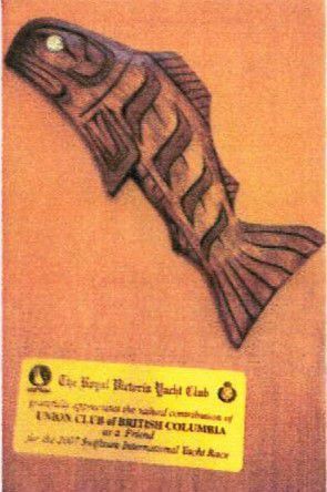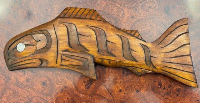 This cedar carving depicts a salmon, that to the First Nations of the Pacific Northwest Coast, is a symbol of perseverance, self-sacrifice, regeneration and prosperity. For thousands of years, Salmon were the primary food source for these First Nations and are highly respected. The salmon shaped the coast cultures and also facilitated the emergence of their distinctive art forms.