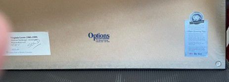 - Verso frame, label printed on paper: 1. Virginia Lewis (1905-1999) Abstract Landscape: Mountains Watercolour n.d. 11"x8-1/2" SOLD $225.00 (logo) Union Club of British Columbia [ From summer 2024 exhibition/sale in Union Club's Renaissance Lounge] - also blue ink stamp for OPTIONS PICTURE FRAMING...and glass type label Note: no signature visible