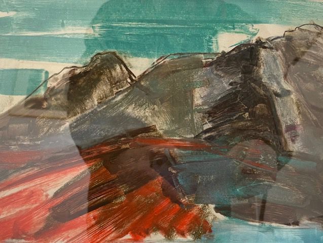 Painting This vibrant Abstract landscape image depicts dark and imposing rocky mountains with a bright orange swath of colour to the left and a turquoise band to the lower right, perhaps to indicate water, as well as the sky above. It is painted with broad flat brush strokes full of motion and energy. The location is unknown, likely B.C.