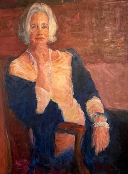 This 3/4 view seated portrait commissioned by Union Club of B.C. depicts Grace Van de Brink, the 72nd and first woman President of the Club. She is relaxed, looking directly at the viewer, her right arm resting on the chair arm with her chin in her right hand set against a rich coral and brown background. Her long apricot-coloured blouse is offset by a deep blue skirt and shawl, and her silver hair is mirrored in her blouse highlights, necklace and some of her bracelets.Type of Painting
