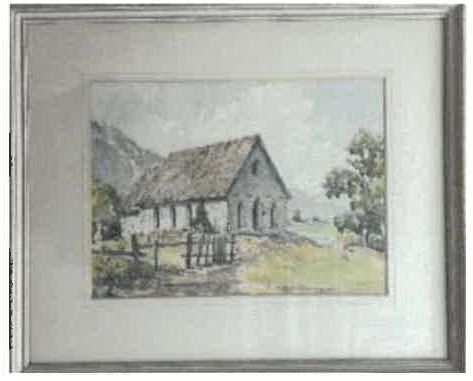 This scene depicts a now-abandoned 19th century sandstone church located on the Cowichan Indian Reserve on Comikan Hill in Duncan, on Vancouver Island B.C., overlooking Cowichan Bay. It is a is a softly rendered representation that balances scenic accuracy at the time with some artistic expression.