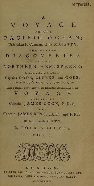 From Captain James Cook, F.R.S. and Captain James King, LL.D. and F.R.S. 1784. "A Voyage to the Pacific Ocean; Undertaken by Command of his Majesty, for making discoveries in the Northern Hemisphere: Performed under the Direction of Captains Cook, Clerke, and Gore, in the Years 1776, 1777, 1778, 1779, and 1780. Being a copious, comprehensive, and satisfactory Abridgement of the Voyage." London:  J. Fielding Paternoster Row. Printed for John Stockdale, Scatcherd and Whitaker, John Fielding, and John Hardy. Vol. II, page 316?, plate 42.