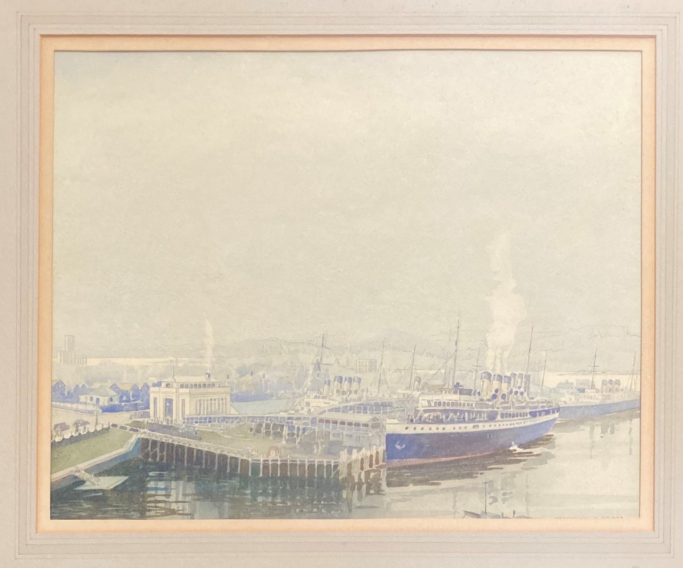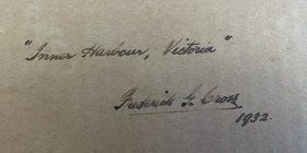 This painting depicts an historical southwest view of part of the inner harbour of Victoria, B.C. populated with various docked ships. The impressive Canadian Steamship Terminal with its massive Ionic columns is located to the left, with part of the James Bay neighbourhood behind, the Ogden Point grain terminal to the far left in the background and Esquimalt in the distance.