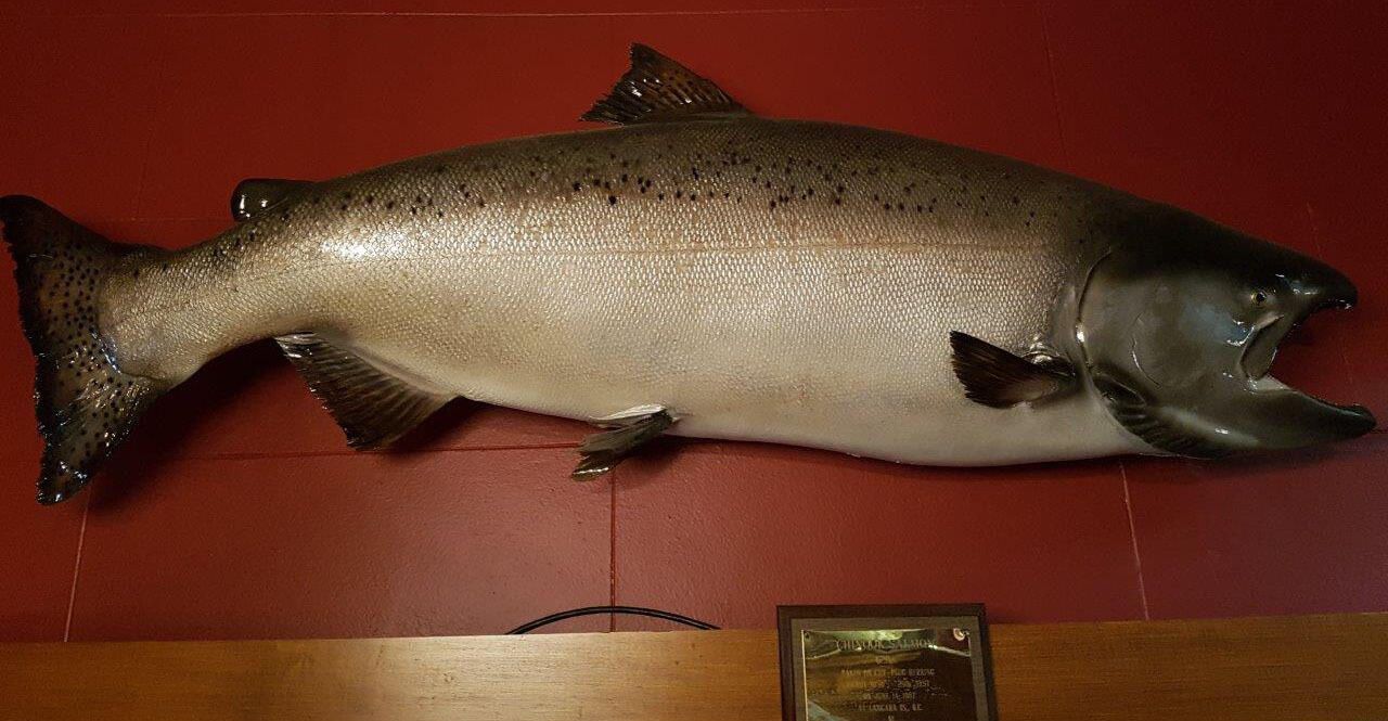 Plaque: Chinook Salmon, 62 lbs [~28 kg]. Taken on cut-plug herring Hardy 10’10”-25 lb. test. On June 14, 1987 At Langara Island, B.C. by J. David Hyslop.