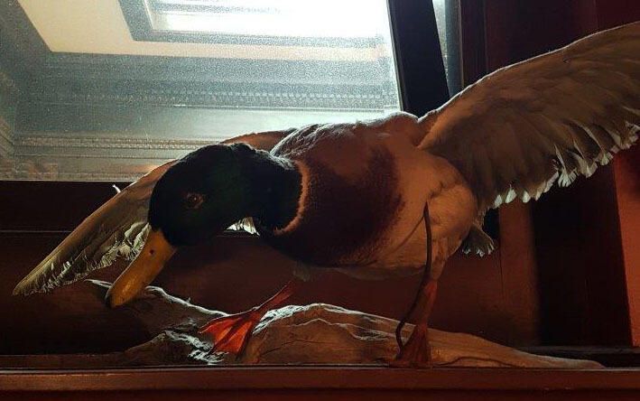 Stuffed and posed Mallard Duck on beech wood branch perch in landing posture with legs and wings outstretched. Faces left.