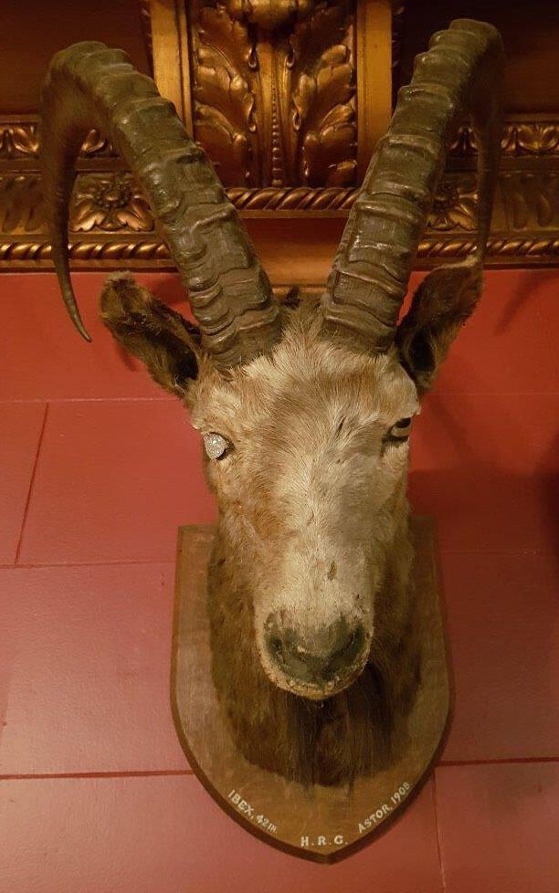 Stuffed and mounted Ibex head and neck, with large recurved horns. Mounted on shield-shaped wood plaque with beveled edge and with inscription lower centre. Faces front.Inscription/Signature/Marks
