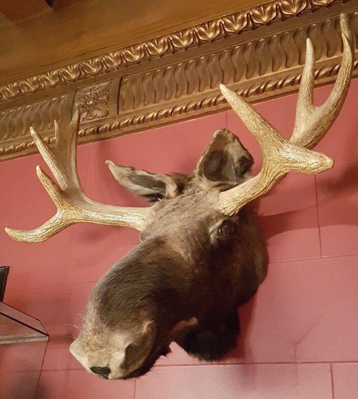 Stuffed and mounted male Moose head with antlers. Faces front.