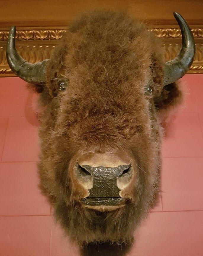Stuffed and mounted Bison head with horns. Faces front.Acquisition