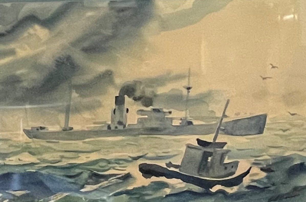 Painting This seascape image depicts a large ship, possibly a Royal Canadian Navy vessel, with a small tugboaat in the foreground in an ominous ocean of roiling waves depicted in blues and greys. The sky is threatening and overall the image seems full of menace. The ship is unidentified and the location is unknown.