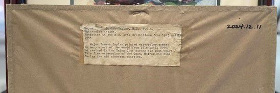According to frame label notations, Major Henry F. Tasker Tayler MC, FCA exhibited artwork in the B.C. Artists Exhibitions at the Vancouver Art Gallery (VAG) from 1943 to 1955. And he painted watercolours in many area of the world including B.C. from 1916 to 1955. He resided in the Union Club of B.C. during his last years. The artist lived in Kelowna in 1943 and 1945, and in Victoria in 1945 and 1946, and on his death in 1963.