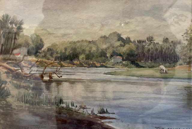 This landscape image depicts the Coum River in Madras, now known as Chennai, in southern India. The vista reflects the long tradition of British watercolour landscape art - a gentle and softly painted view leading the eye from a foreground shoreline across the curve of the river to a farmer in white bending in a grassy field across to the background shoreline with a forest of tall trees and buildings in partial view. It is a representation that balances scenic accuracy at the time with artistic expression.Artwork Details