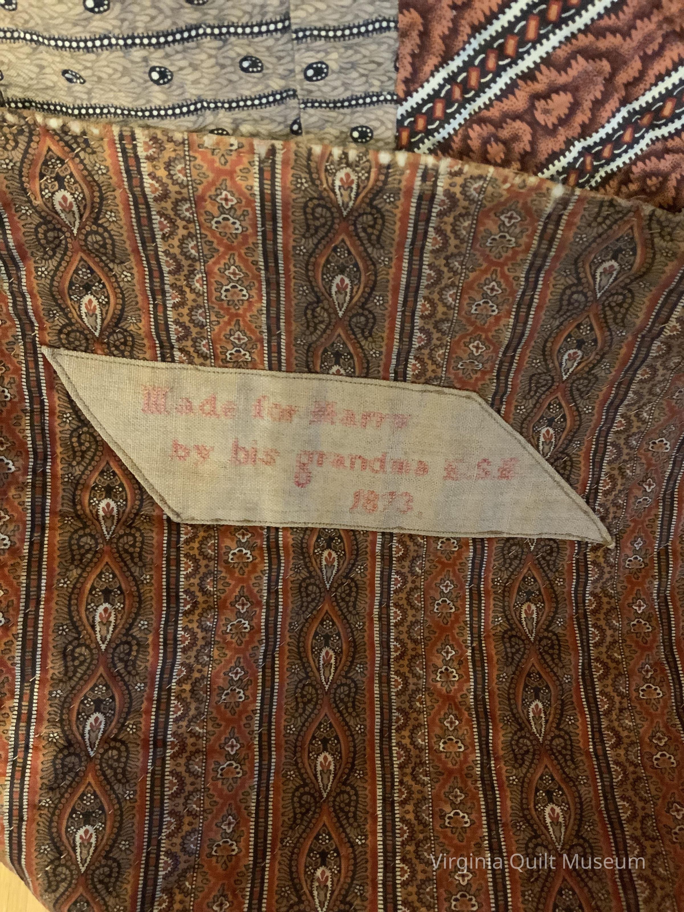 Hand-pieced and hand-quilted. Used centennial colors and multiple prints. The backside of the quilt contains a label with cross-stitching: "Made for Harry / By his grandma E.S.E./ 1873"Context