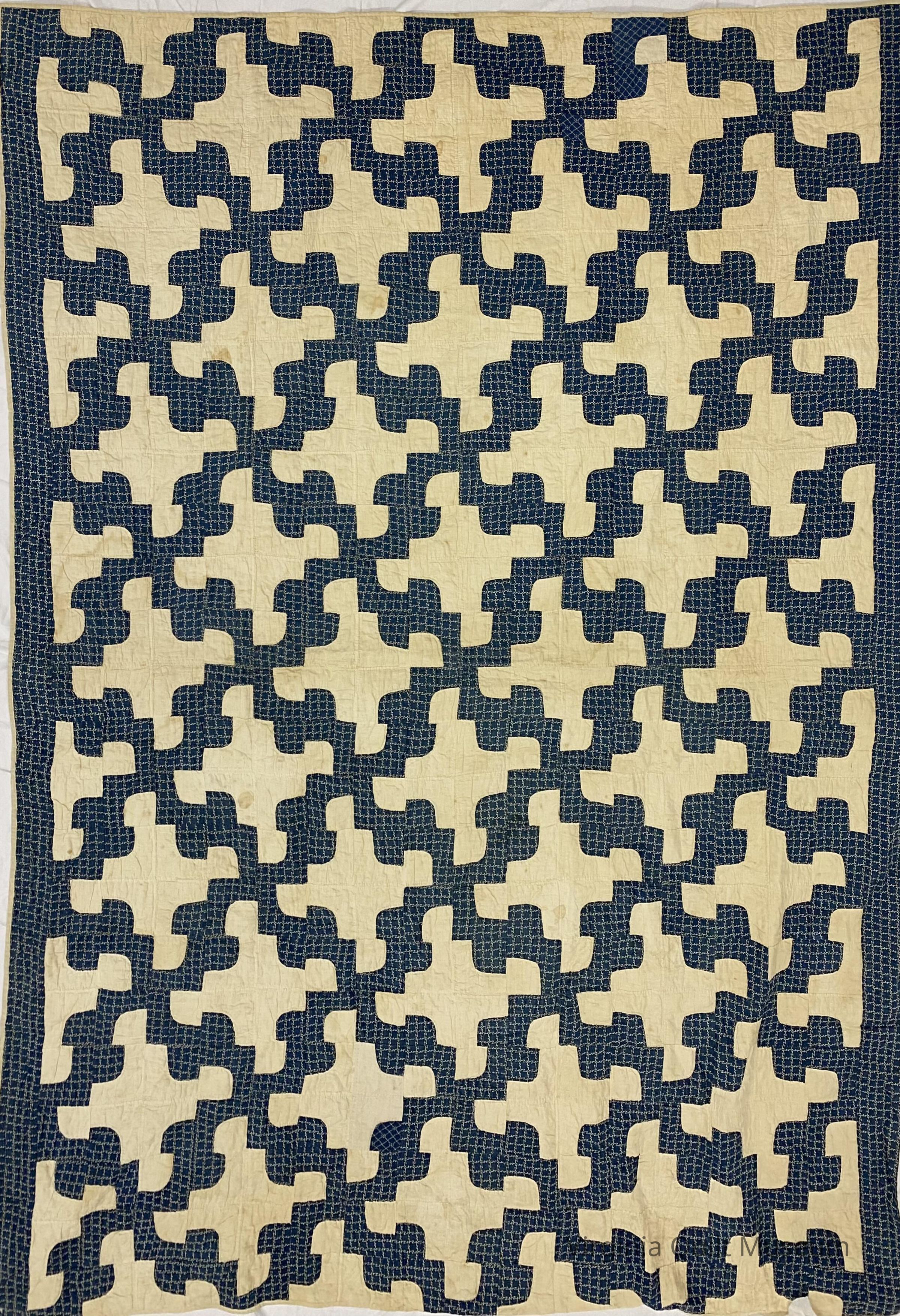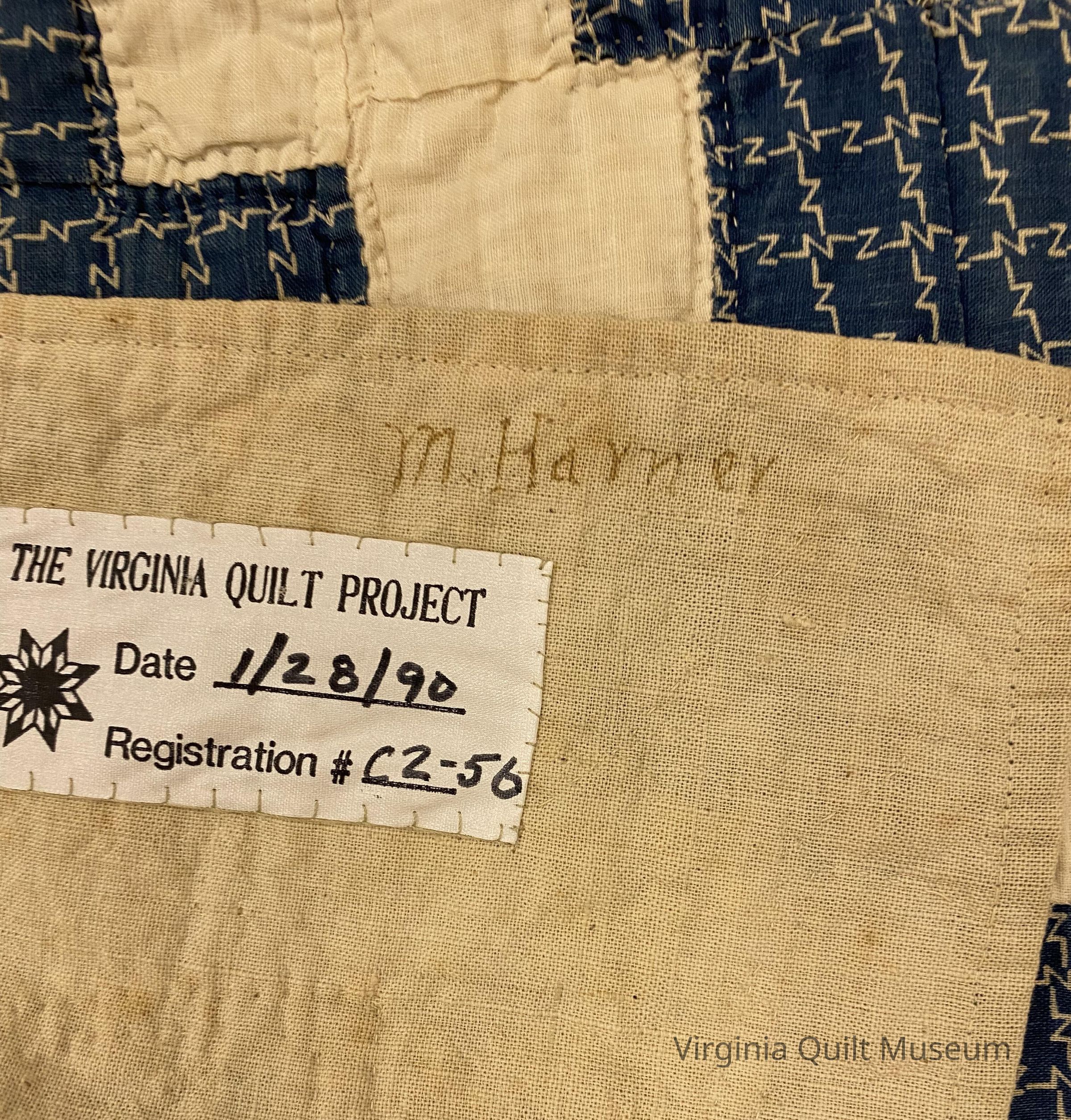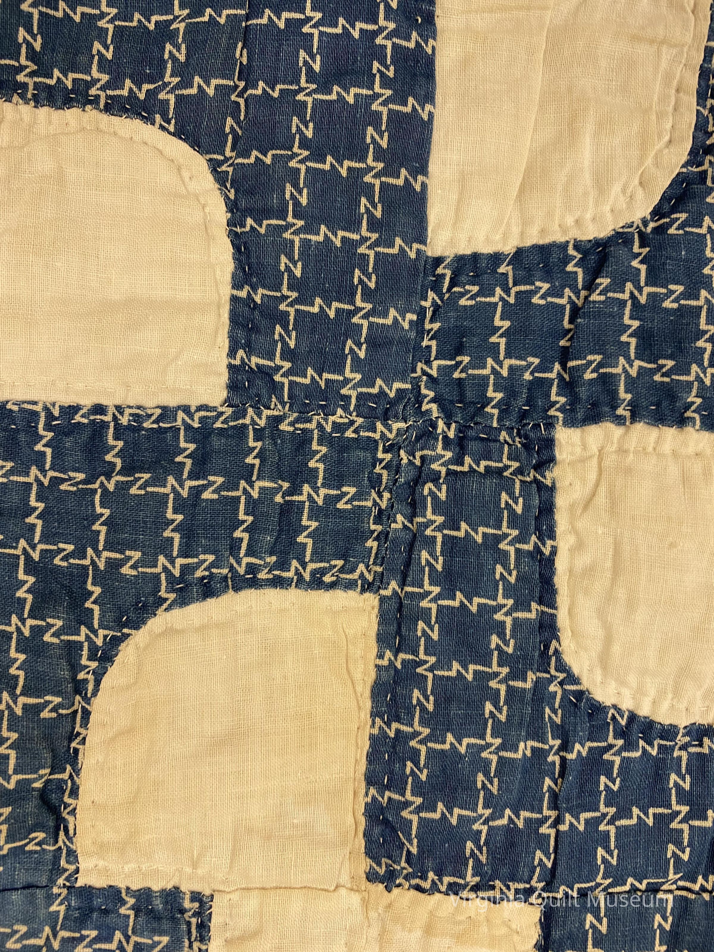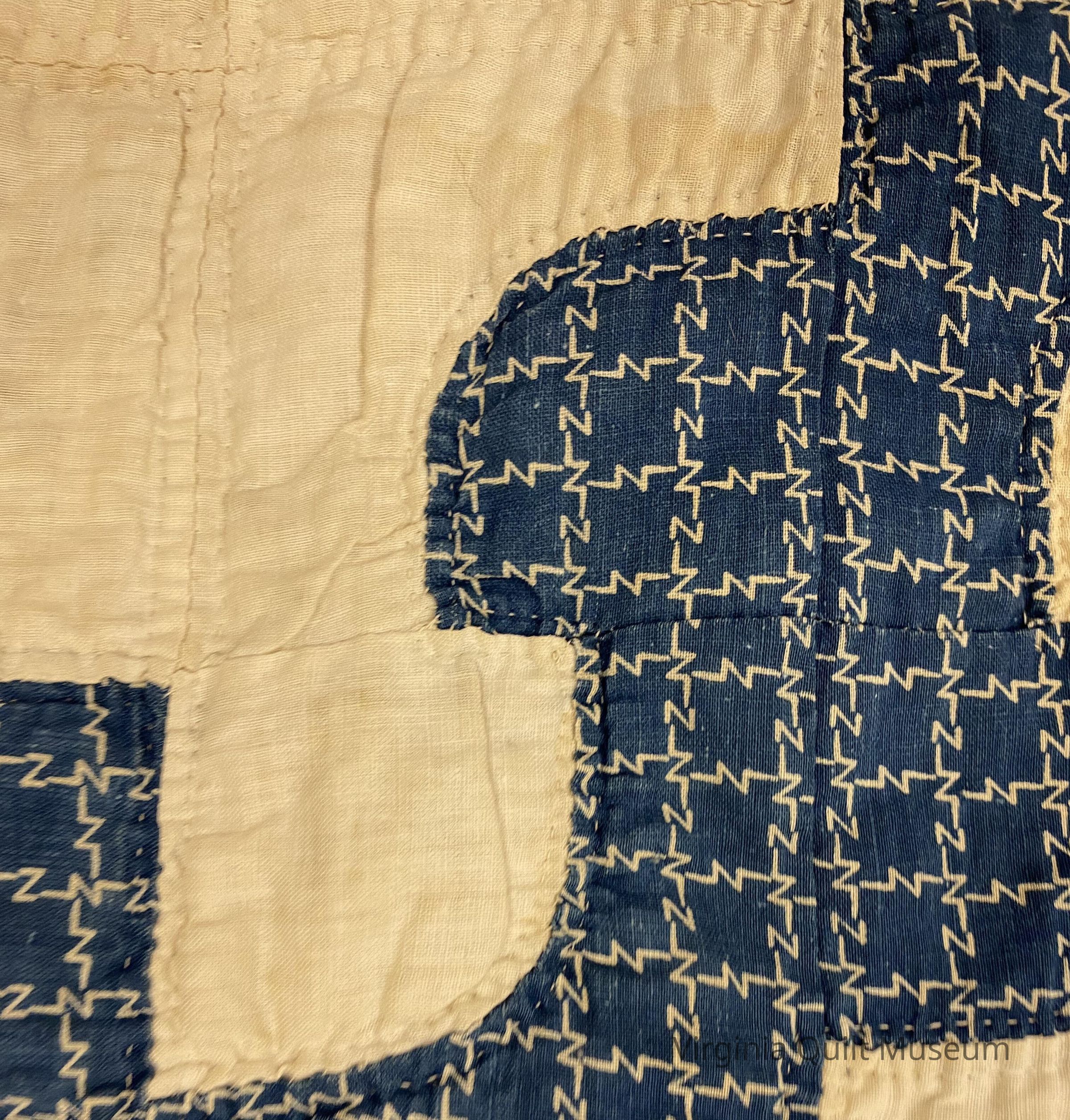 Contains 96 six-inch blocks. Pieced with purchased solids and prints in blue and white. Side borders are 2.25 inches wide with a hand pieced backing of horizontal strips. Binding is back to front. The batting is very thin cotton with seeds.Context
