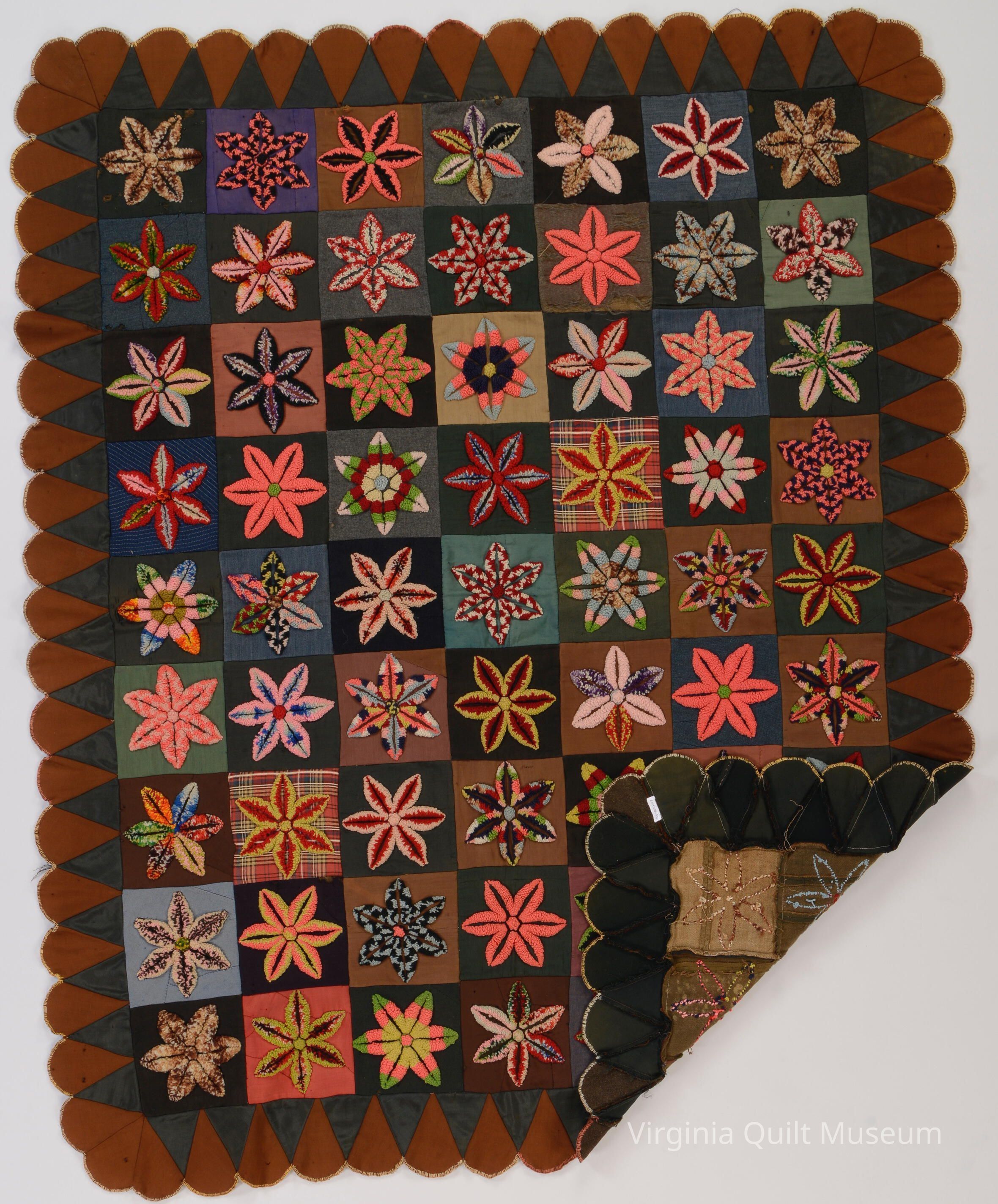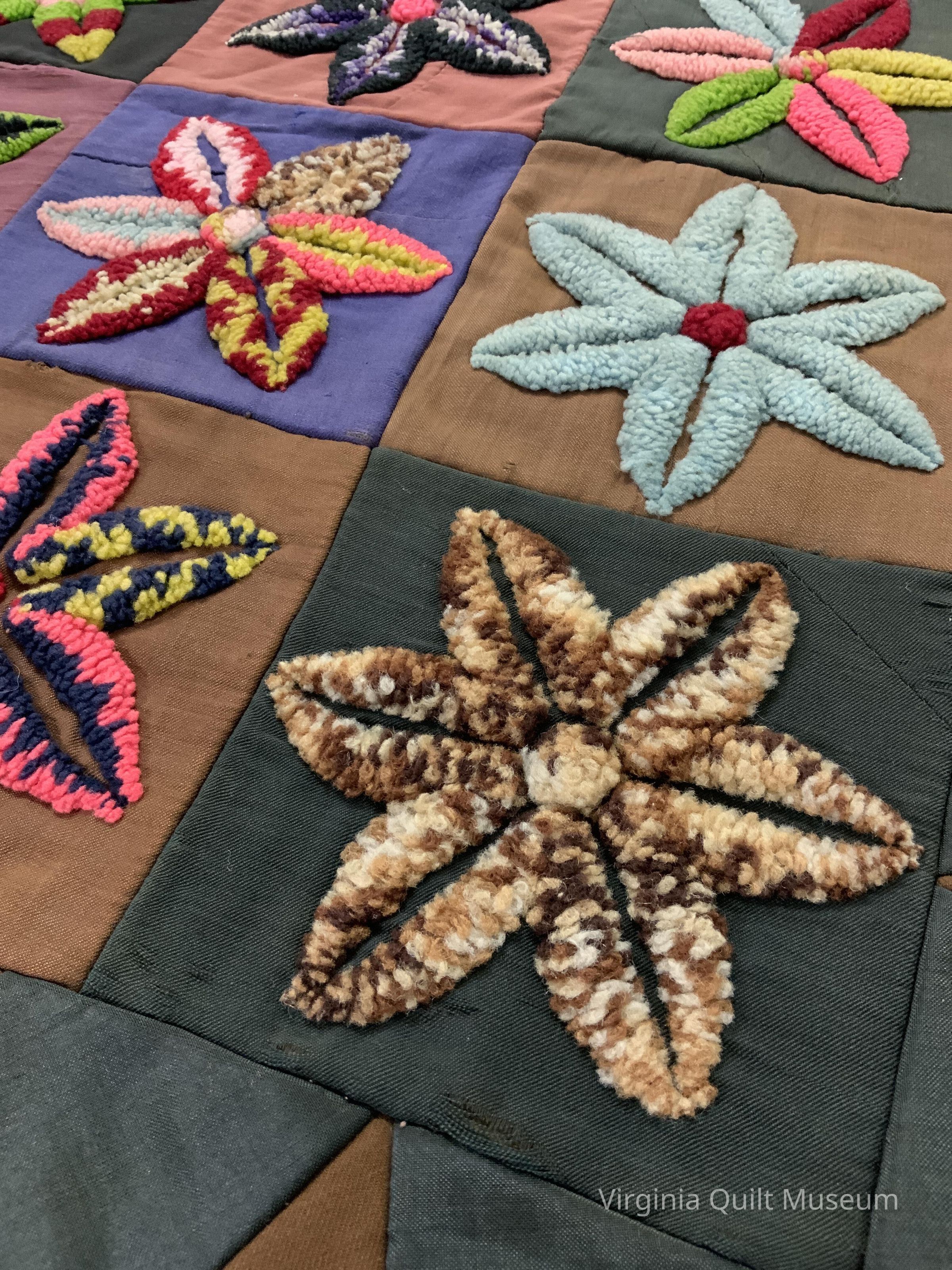 Hand pieced. Unfinished on the back. Punched wool flowers design on wool and other fabrics. Finished top.Context