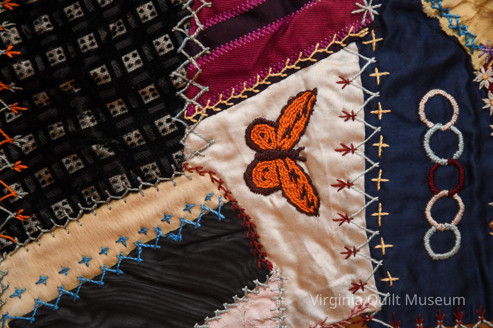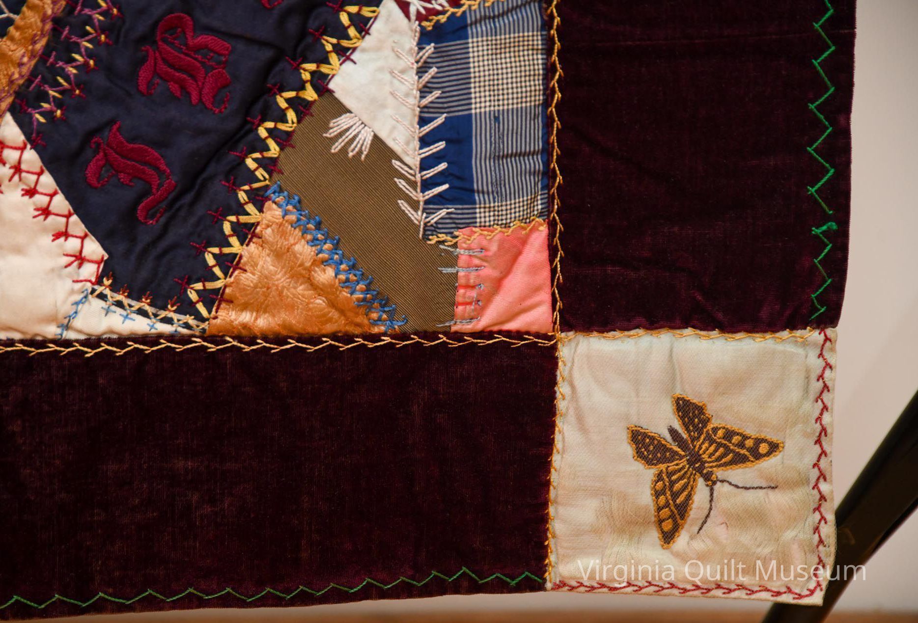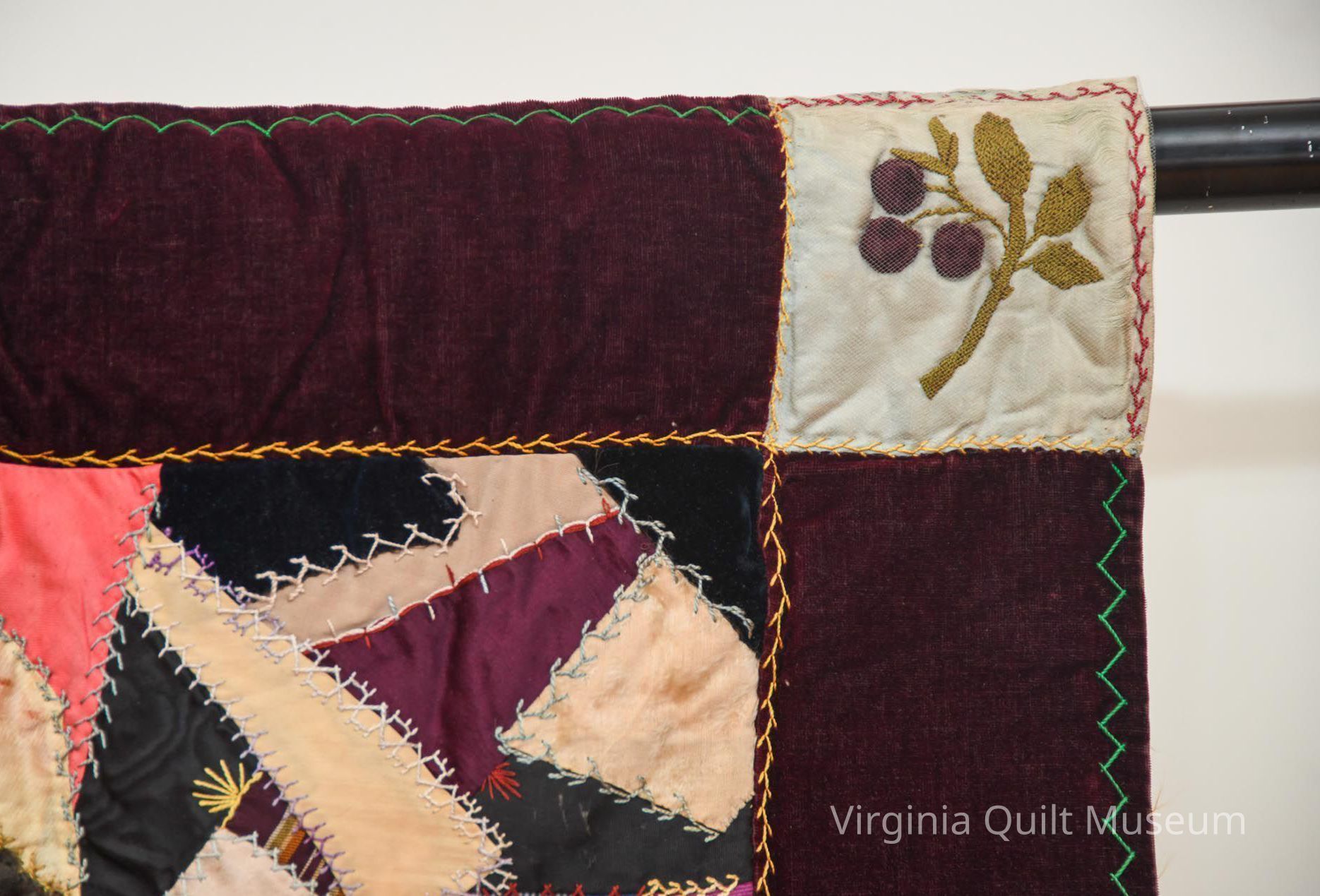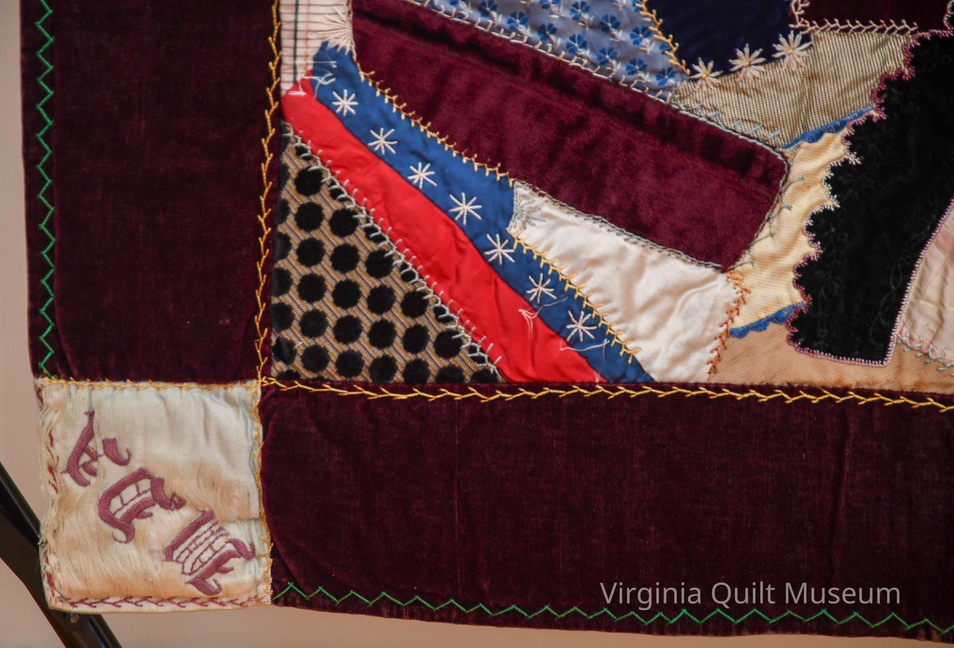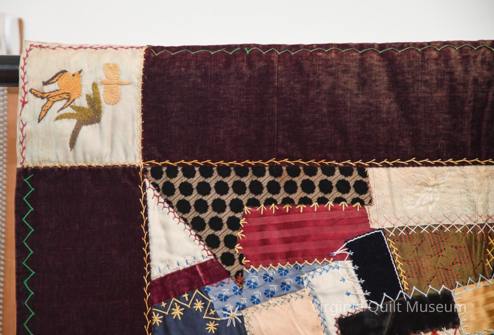 Silk, Velvet, and Satin quilt. Striped silk backing. Small degree of conservation work done. Black border.Context