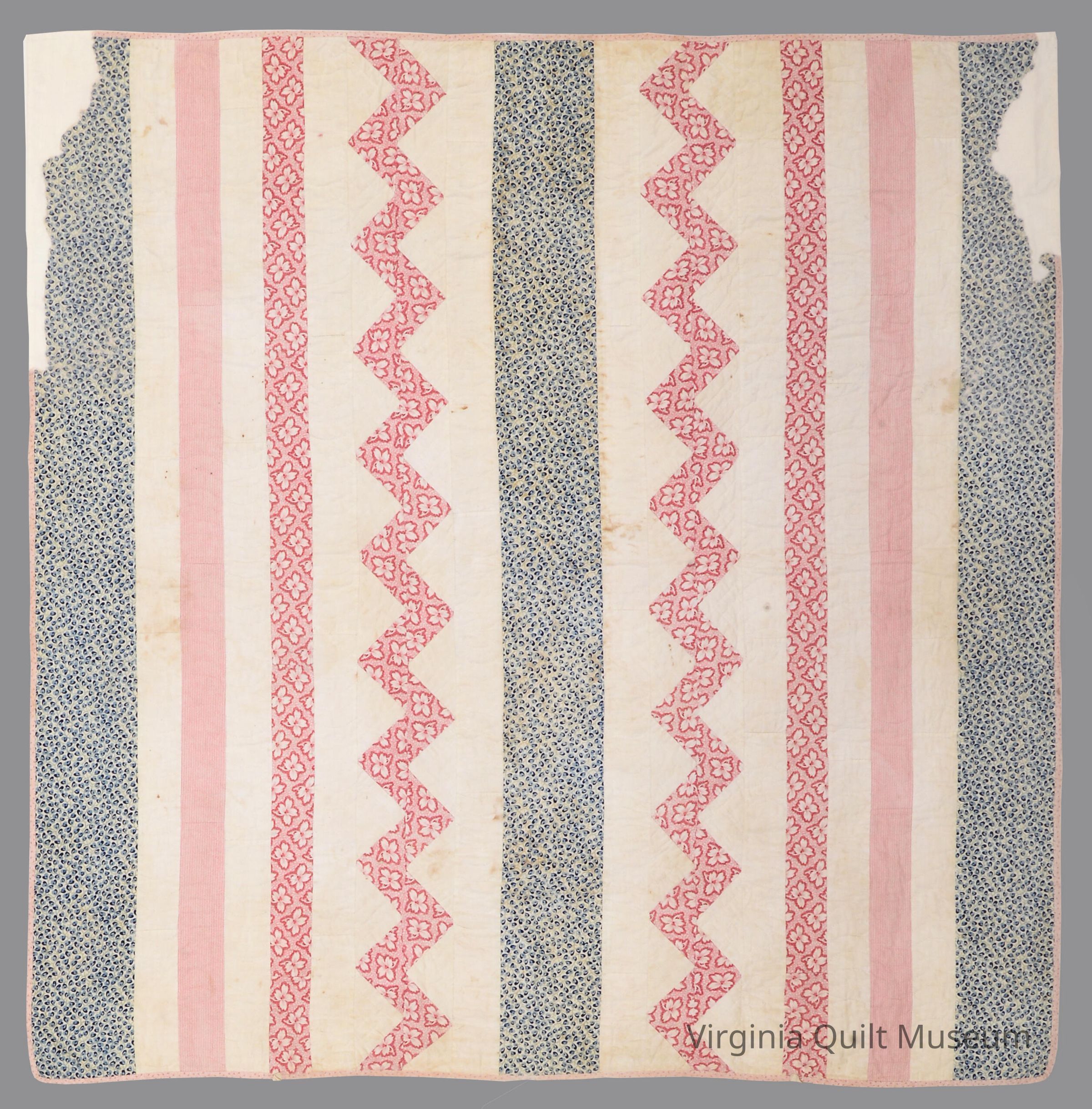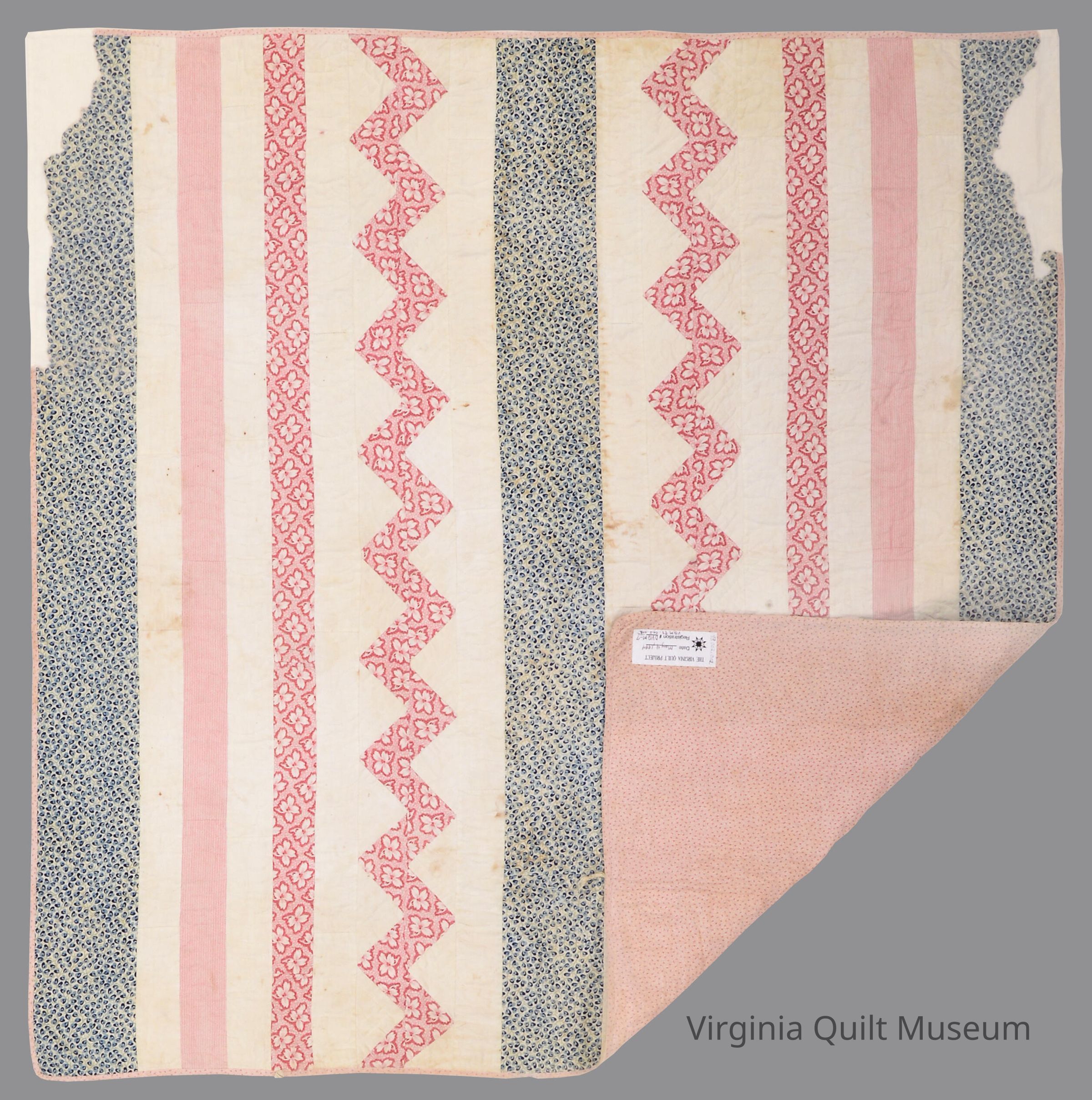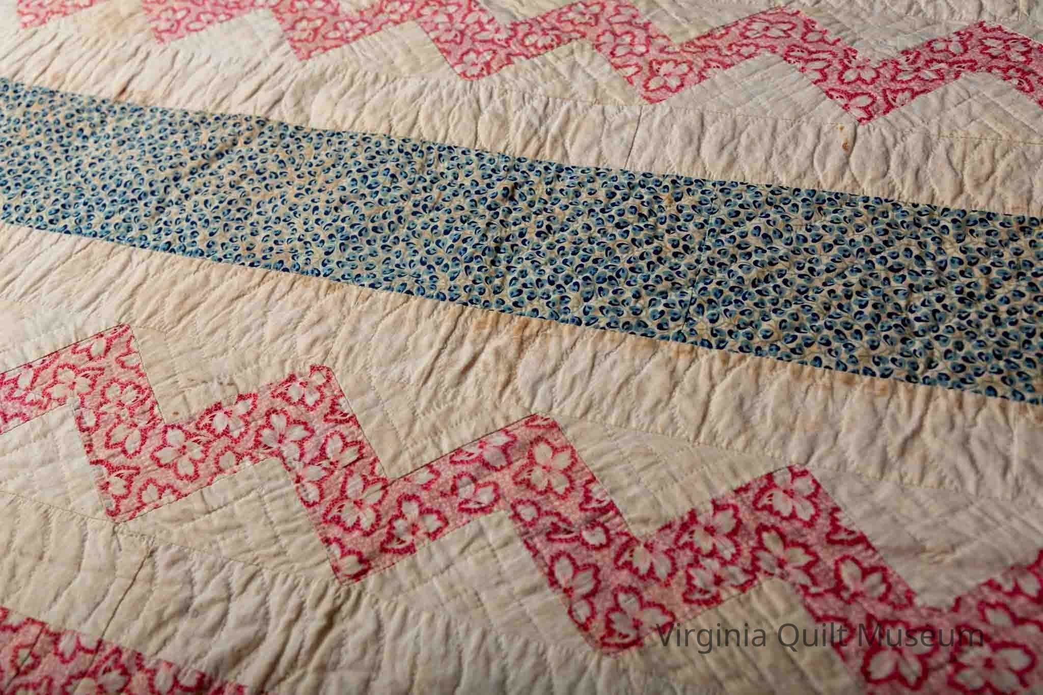 Made of high-quality cotton, this quilt is designed with lengthwise strips of fabric. Two of the strips are pieced. A blue print is in the center, next a white plaindye, zig-zag (the zig-zag, or Streak of Lightning, pattern is found often on early Shenandoah Valley quilts) of white and pink print, white, a pink print, white, another pink print, white, and lastly the blue print again. The white has become a soft off-white from aging.