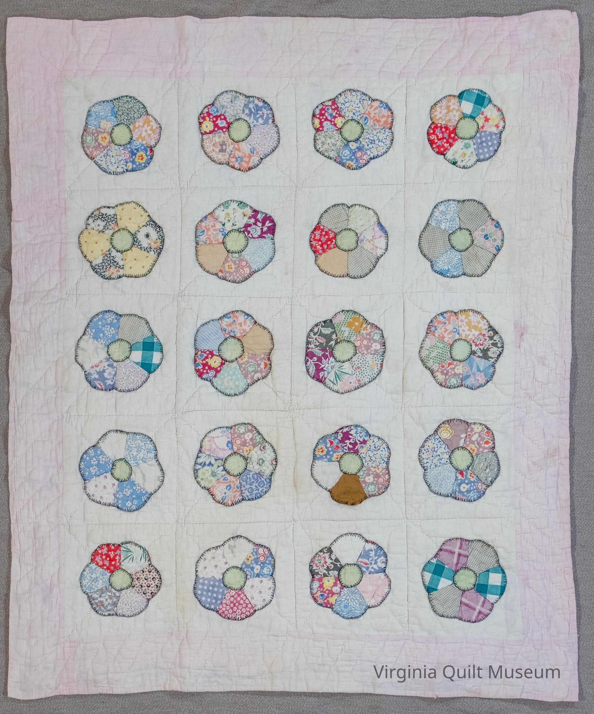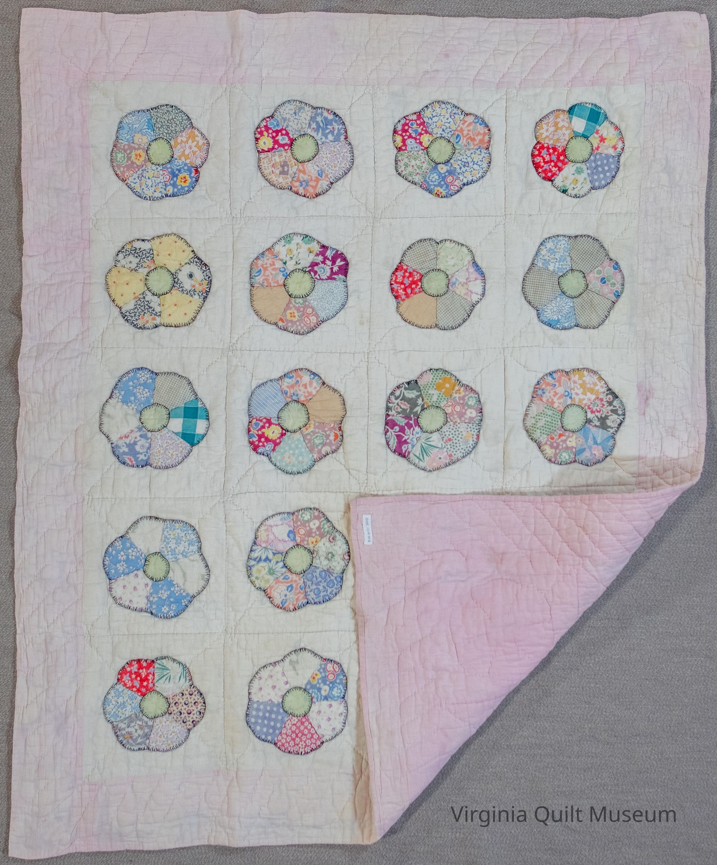 Dresden Plate crib quilt. 20 blocks. The plates pieced together are prints and are appliquéd onto a white background. There is a thick pink border and backing.Context