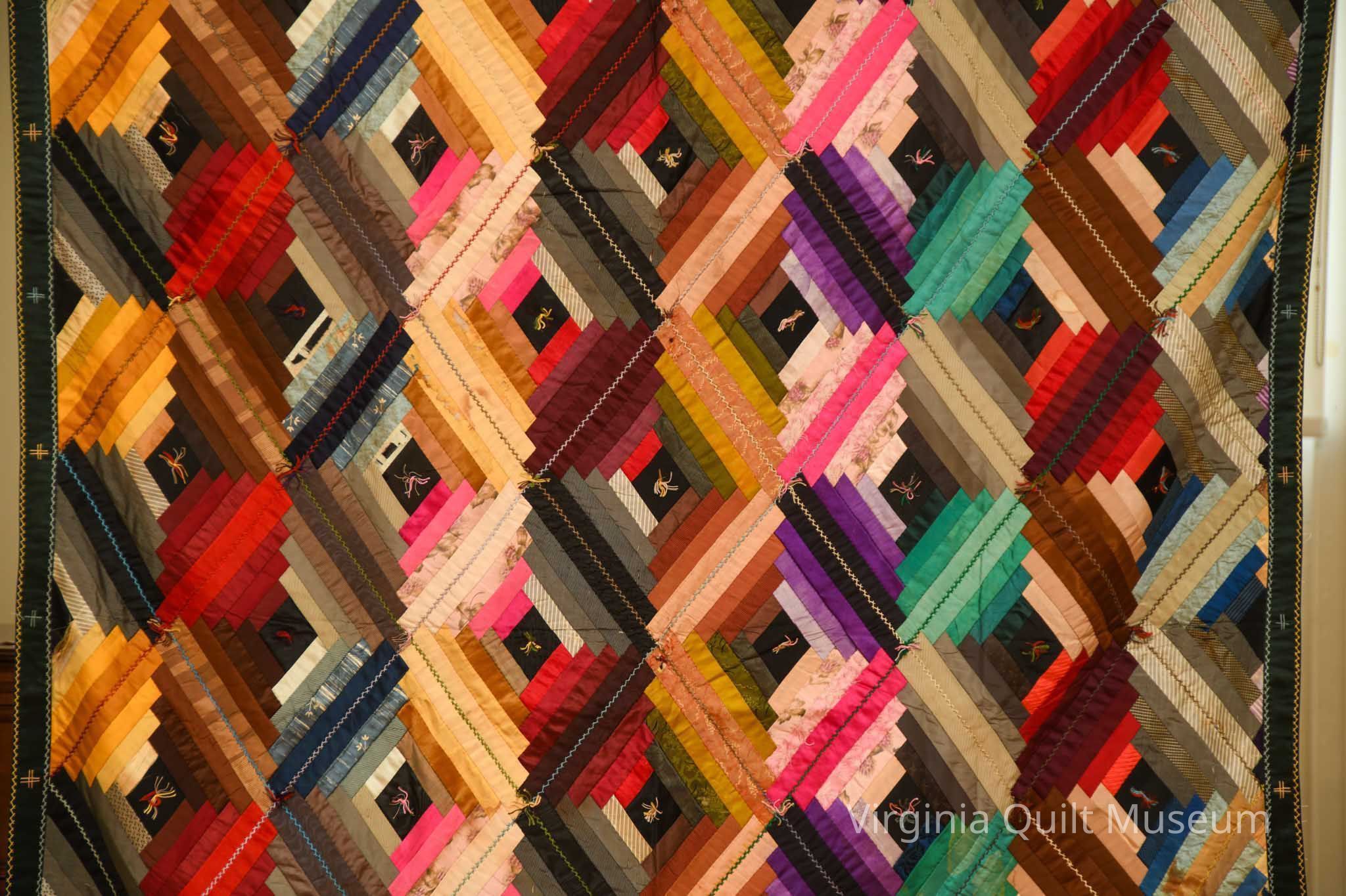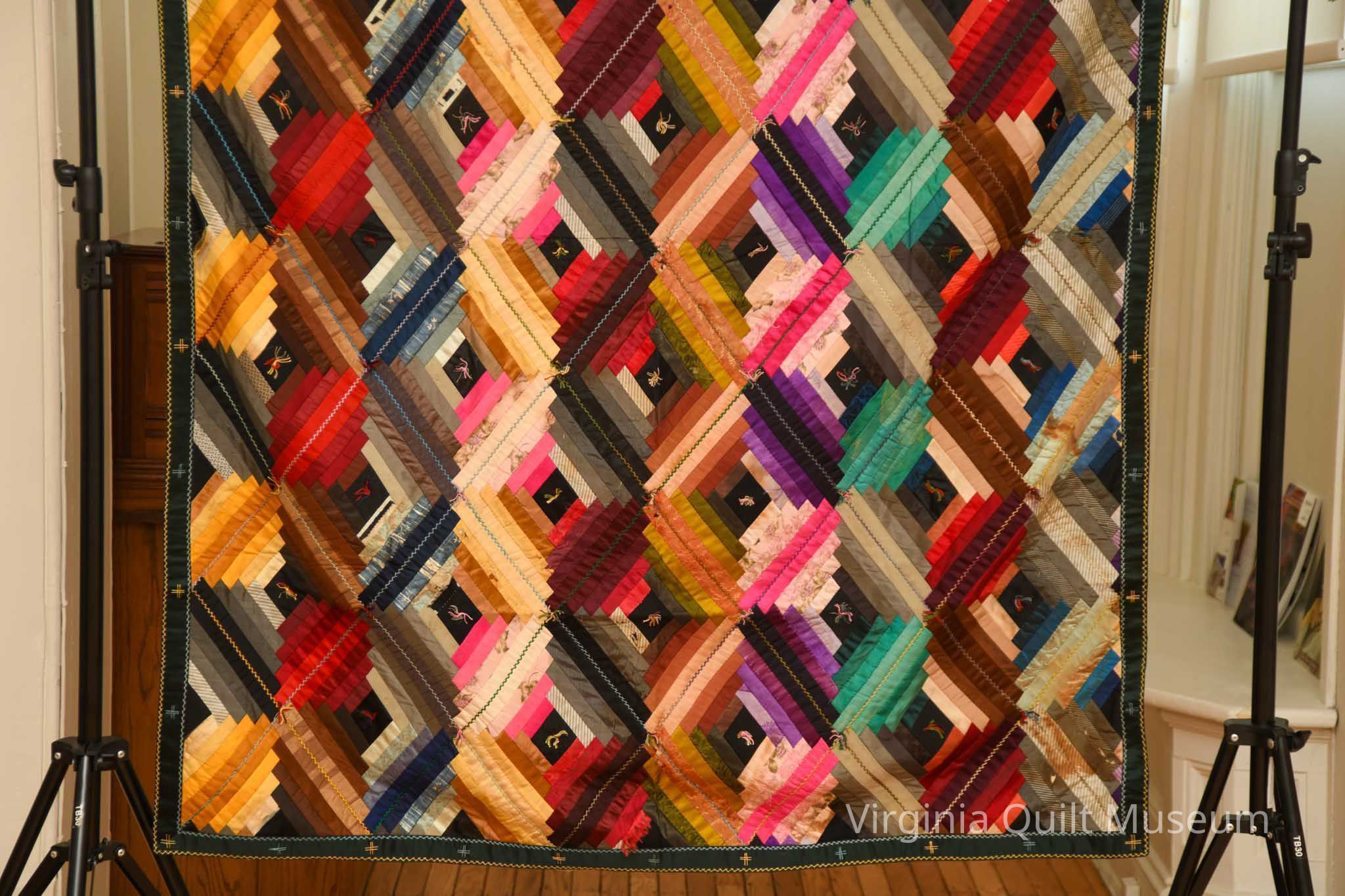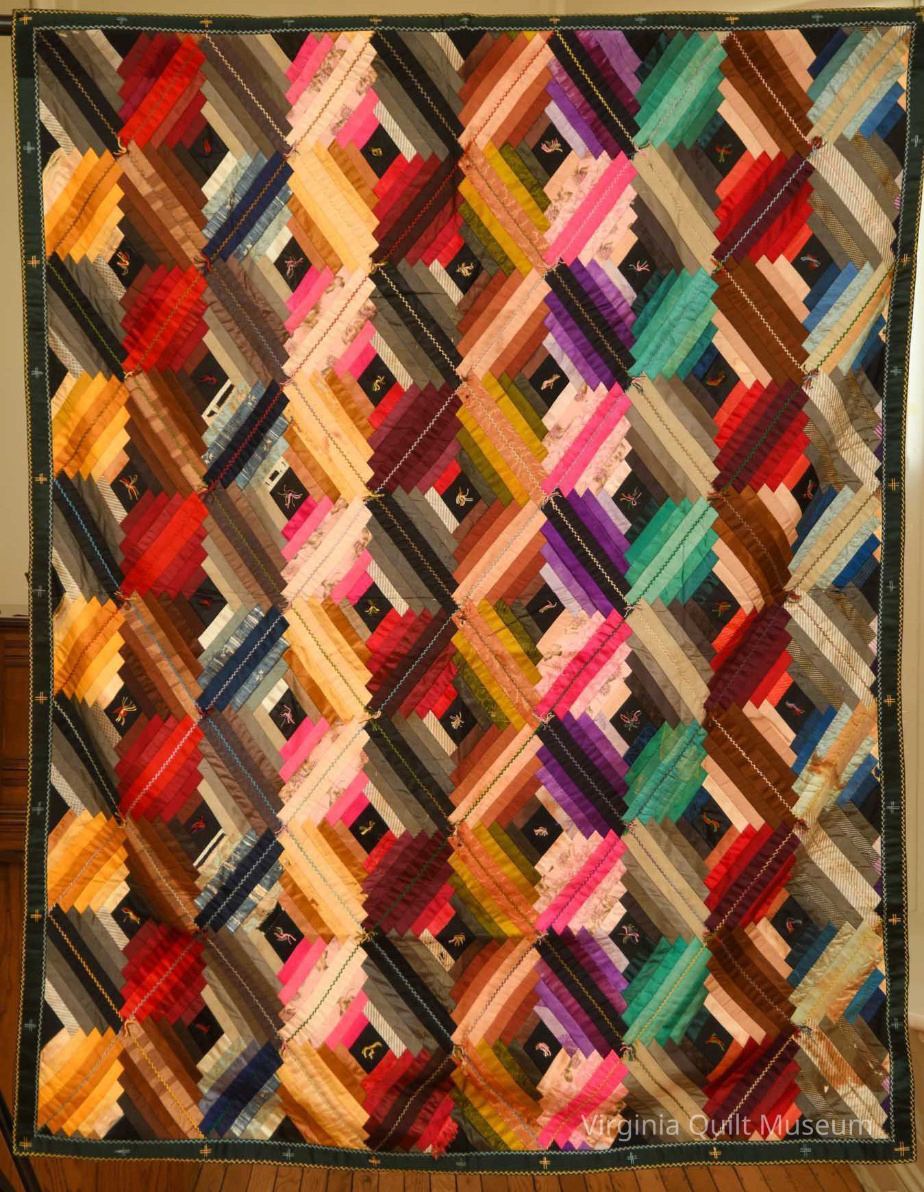 The log cabin blocks were made in a diamond shape starting with the center black diamond patch. Blocks were arranged so colors run lengthwise of the quilt. There is a single border. It is an embroidered green synthetic fabric about 1 1/2'' wide. The border is a new addition, likely added later.