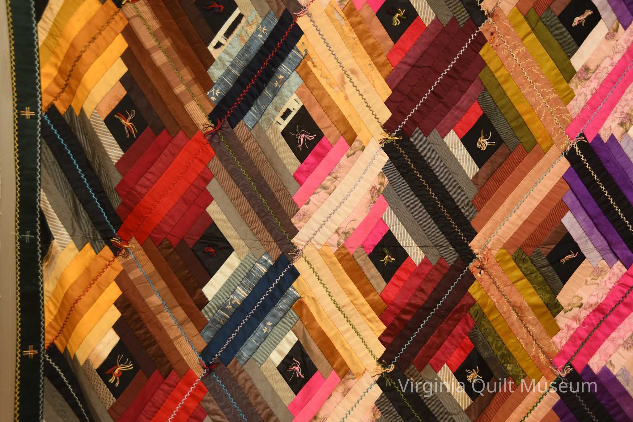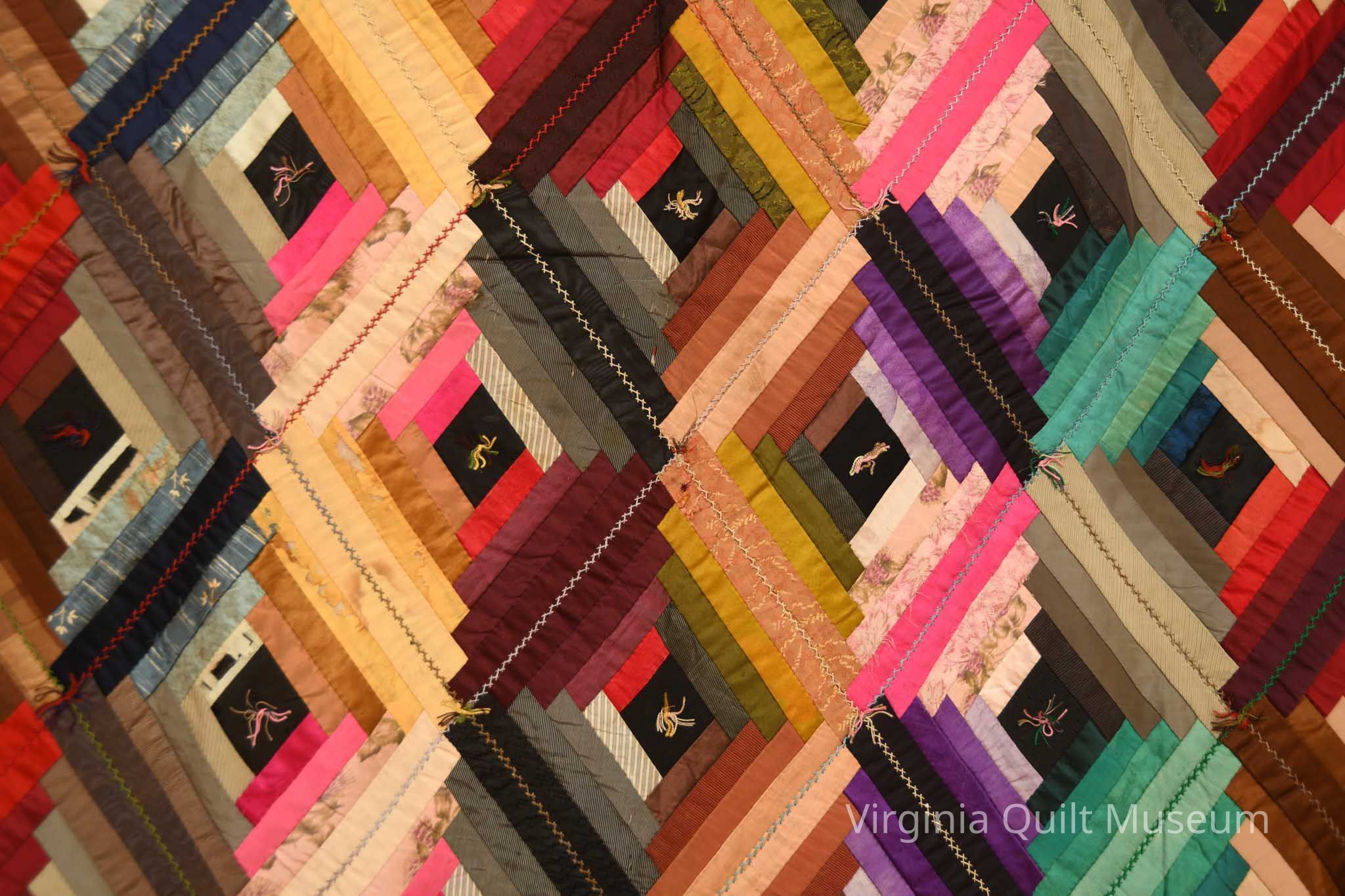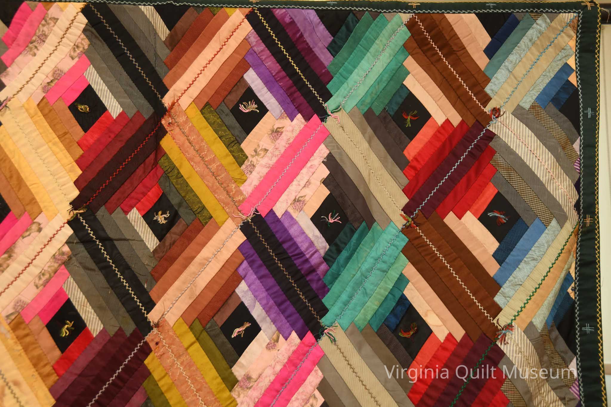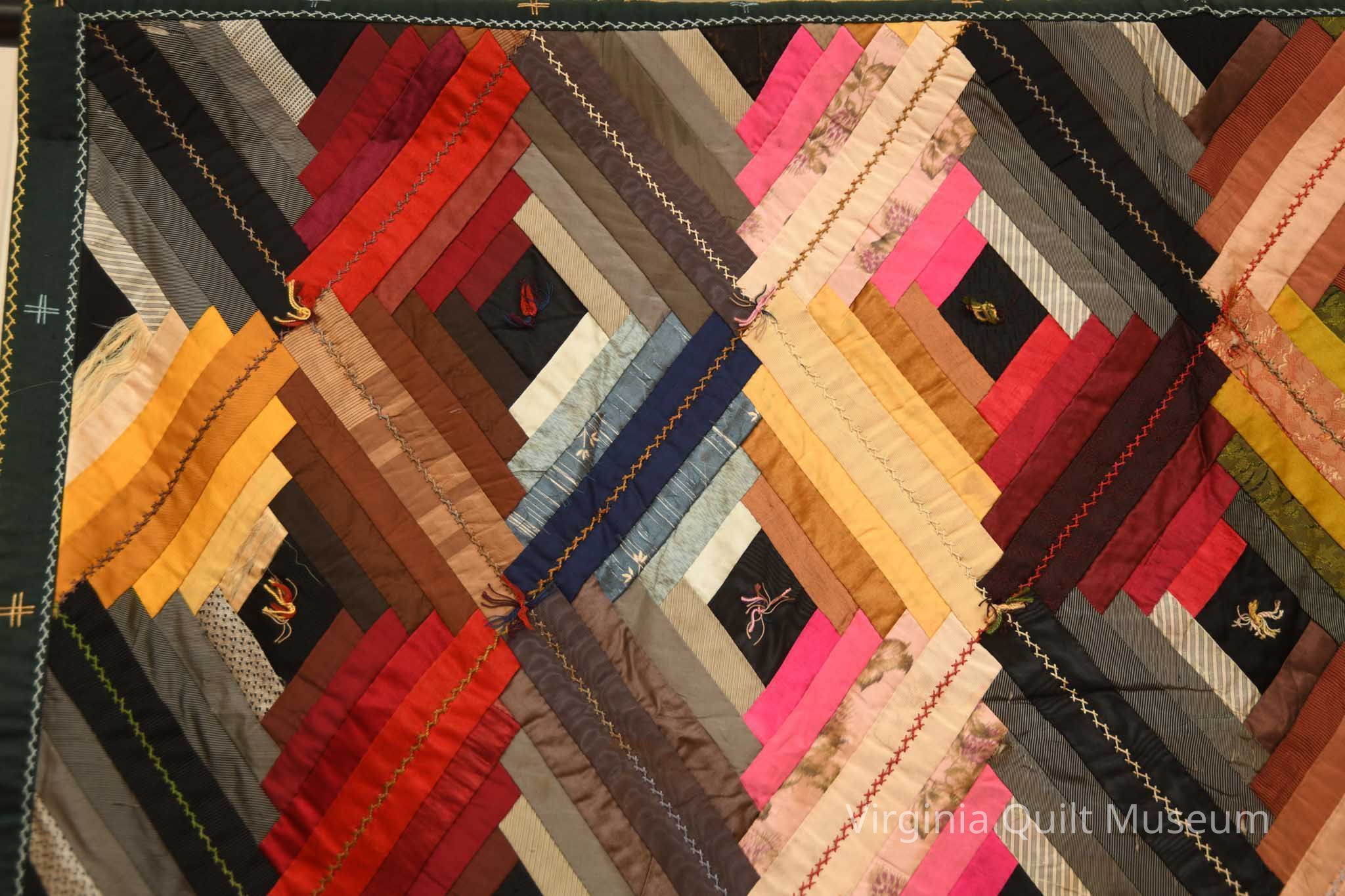 The log cabin blocks were made in a diamond shape starting with the center black diamond patch. Blocks were arranged so colors run lengthwise of the quilt. There is a single border. It is an embroidered green synthetic fabric about 1 1/2'' wide. The border is a new addition, likely added later.